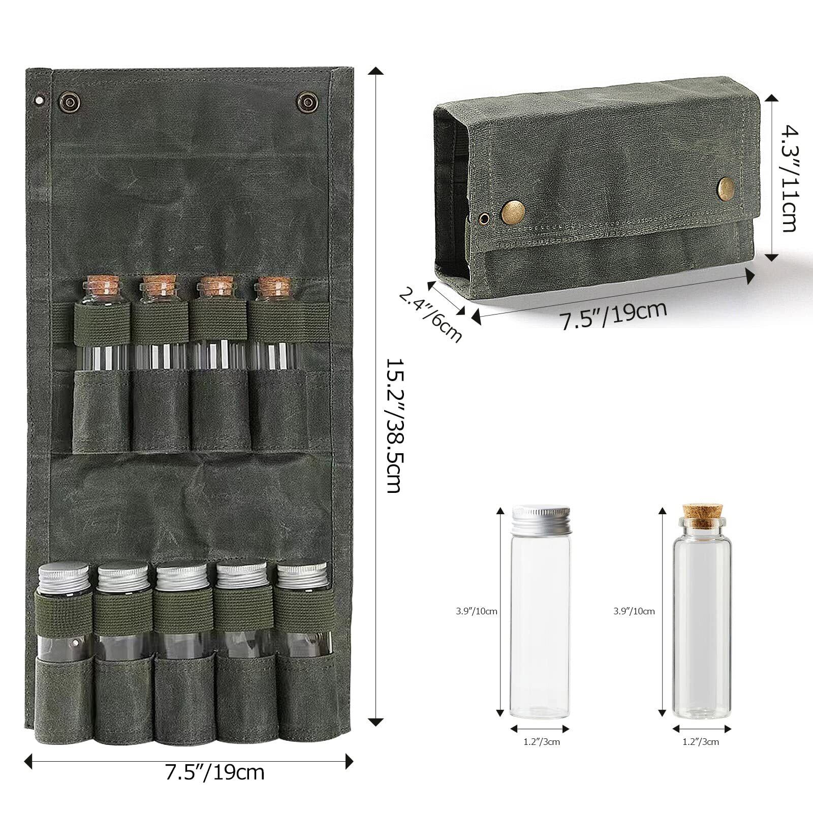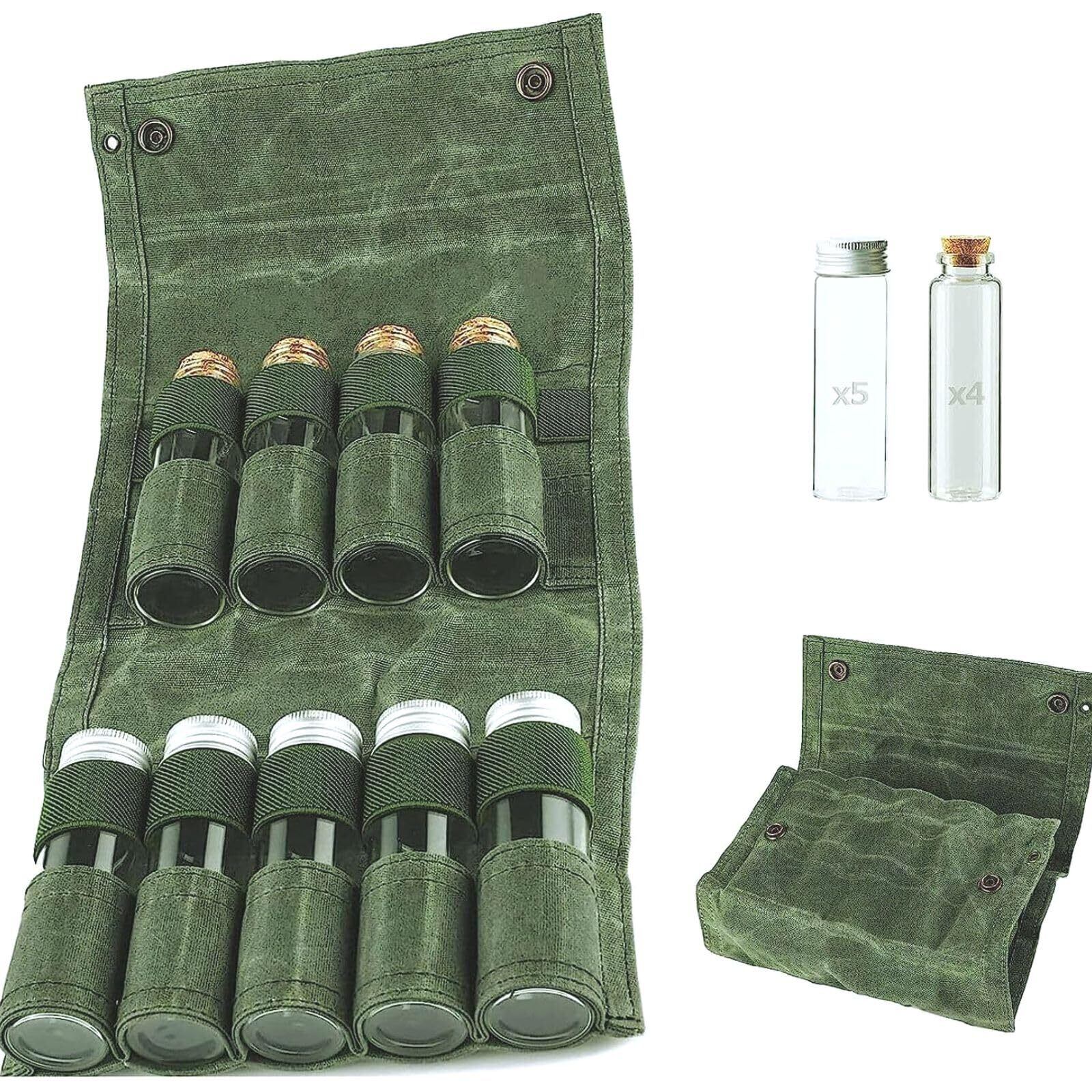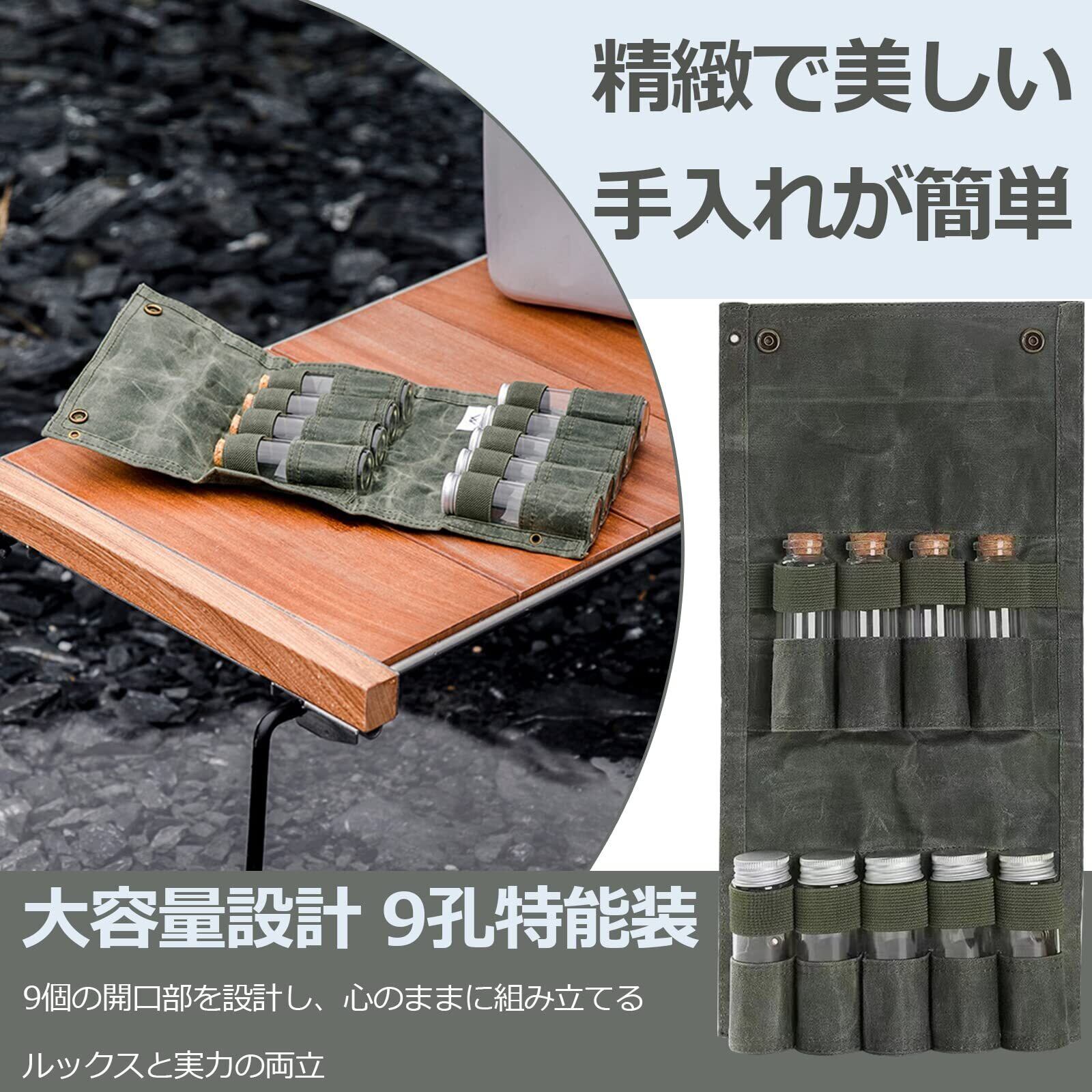 【高品質 スパイスボックス】キャンプ 調味料入れ アウトドア 収納袋は密織油ワックスのキャンバス素材を採用しています。さらに、パラフィン加工により優れた撥水性を実現しています。高品質で無毒なガラススパイス瓶9本を同封されて収納可能で、頑丈でありながらお手入れも簡単です。