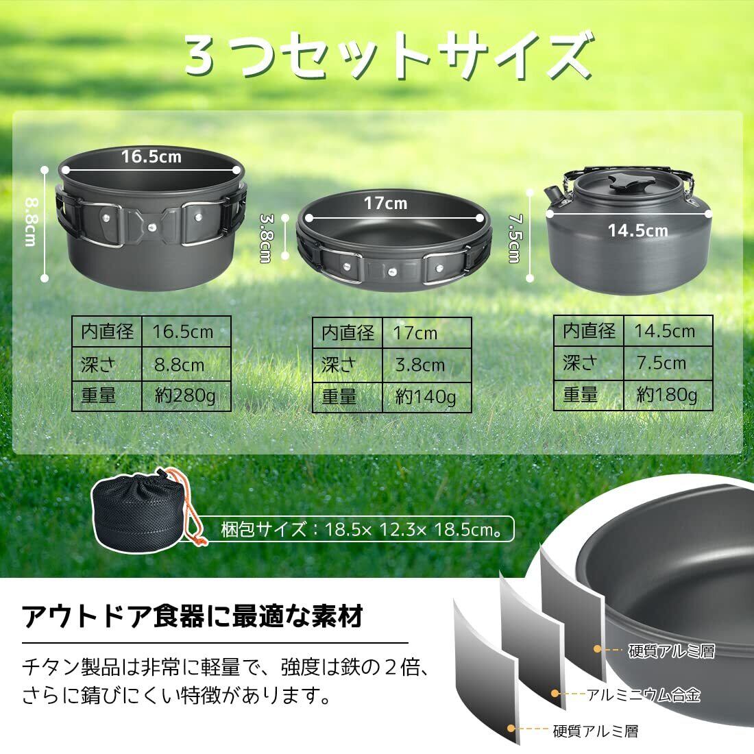 【クッカーセット仕様】材質:本体(アルミニウム合金)、ハンドル(ステンレススチール+樹脂)。クッカー3点セットのサイズ(本体のみ、取っ手を含まない):鍋:内直径16.5cm×深さ8.8cm、重量:約280g。フライパン:内直径17cm×深さ3.8cm、重量:約140g。ケトル:内直径14.5×深さ7.5cm、重量:約180g。梱包サイズ:18.5×12.3×18.5cm。セット内容:鍋、フライパン、ケトル、収納袋。【製品保証】出荷前検品を行っておりますが、万が一製品に使用に支障が出るような破損や不具合などがございましたら、購入履歴よりご連絡くださいませ。交換や返金など、必要なご対応をさせて頂きます。