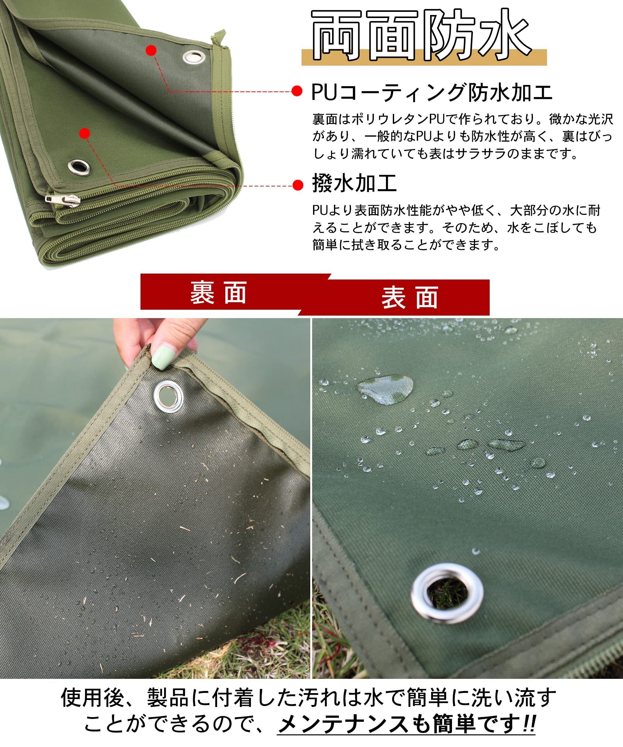 【防水防汚】グランドシートの表面は防水オックスフォード布で作られており、撥水性があります。そのため、水をこぼしても簡単に拭き取ることができます。裏面はポリウレタンPUで作られており、プラスチックとゴムの間にある新しい素材です。微かな光沢があり、一般的なPUよりも防水性が高く、裏はびっしょり濡れていても表はサラサラのままです。キャンプで一泊するときに使っても汚れません。使用後、製品に付着した汚れは水で簡単に洗い流すことができるので、メンテナンスも簡単です。