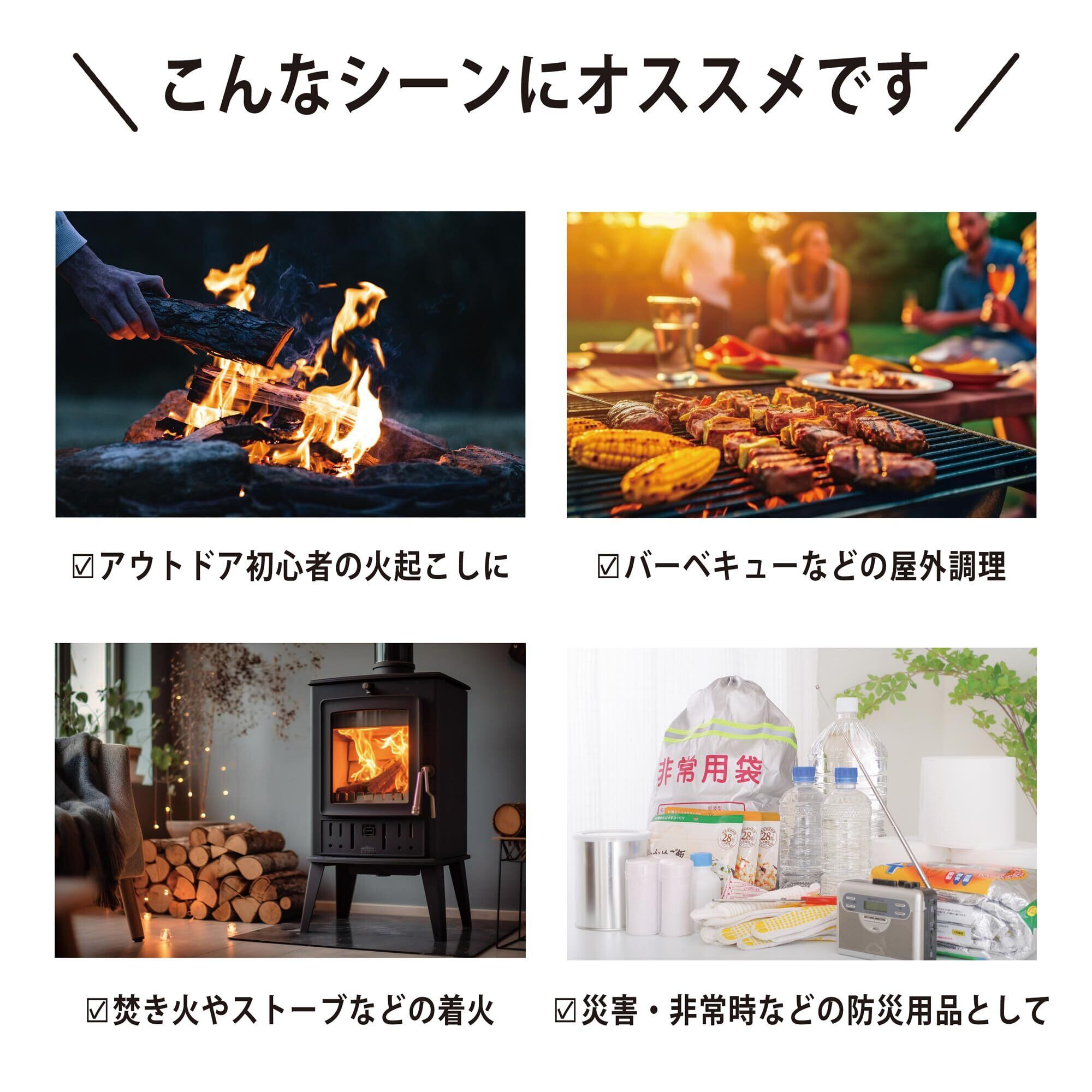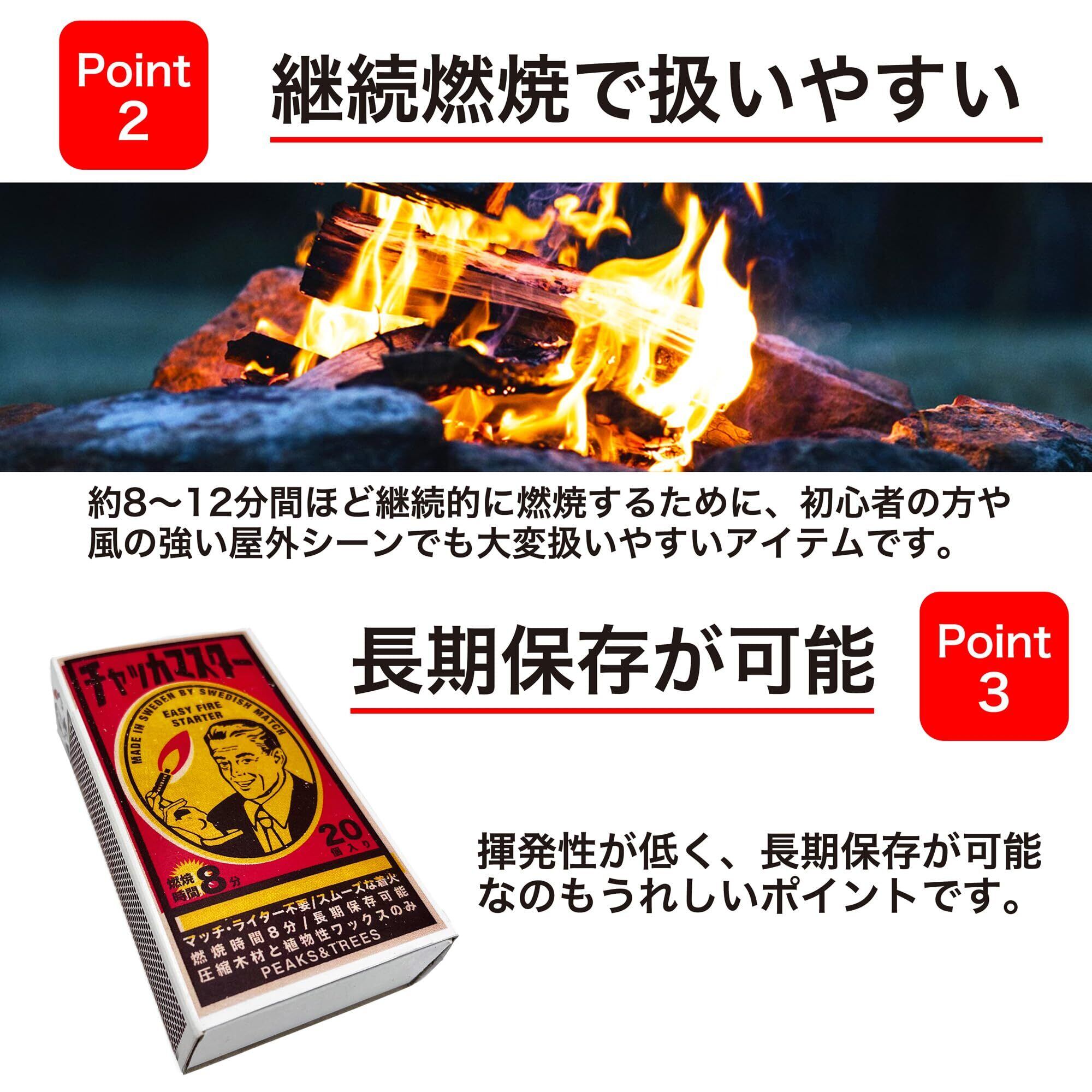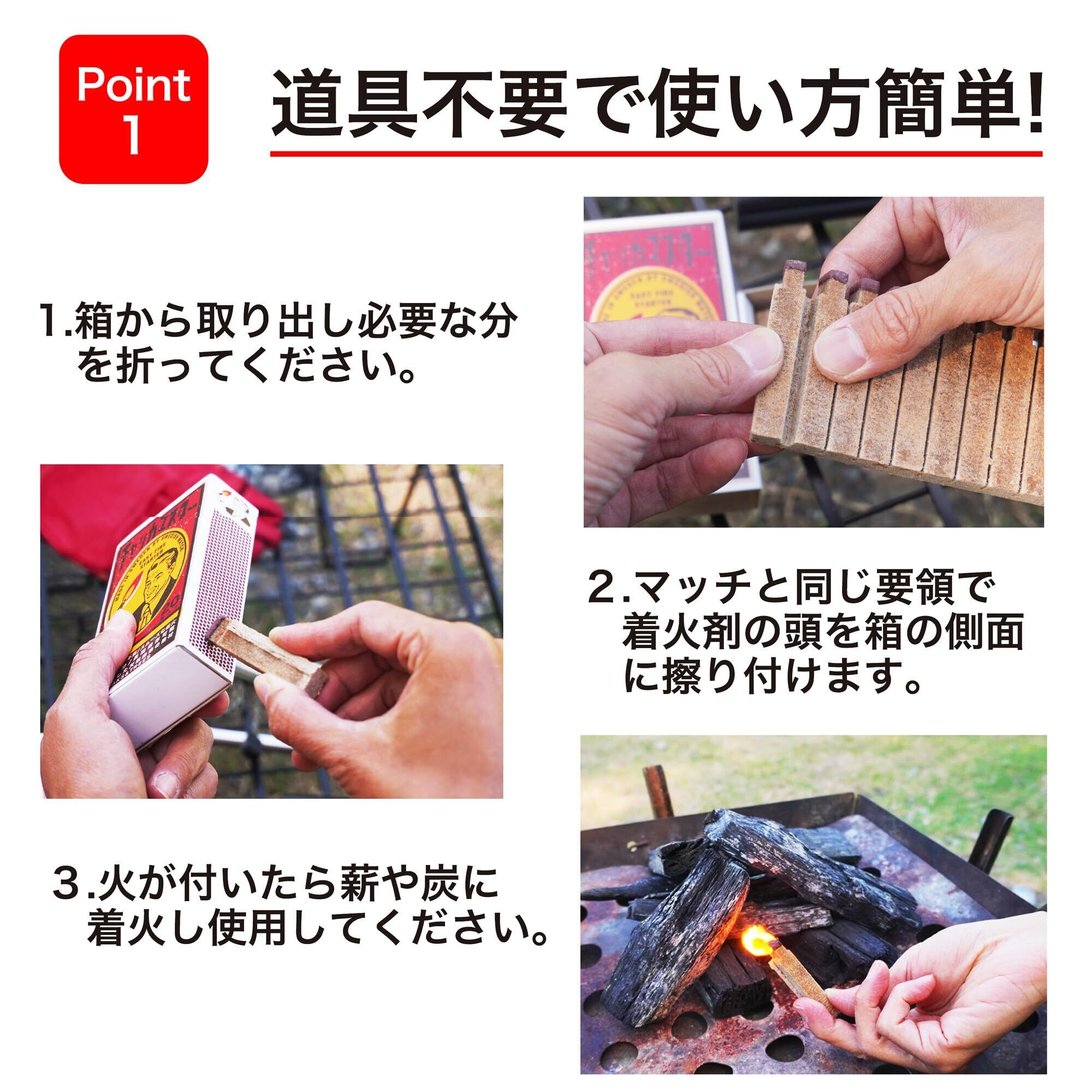 【道具不要!簡単火おこしが可能】マッチやライター、バーナーなどの道具は不要!マッチと同じ要領で中身の着火剤を箱に擦って火を点けることが可能ですキャンプ初心者にもおすすめのアイテムです!
