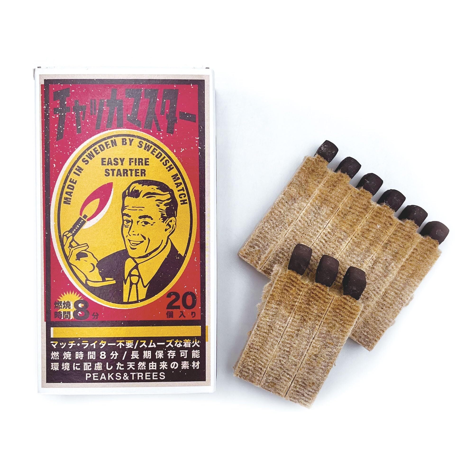 PEAKS&TREES マッチ型 着火剤 キャンプ バーベキュー ファイヤースターター 20個入 FIRESTARTER HEAD COMPOSITION 火起こし 薪ストーブ 焚き火 燃料 天然素材 アウトドア 長持ち 長時間燃焼 ライター不要 防災用品 (1箱)