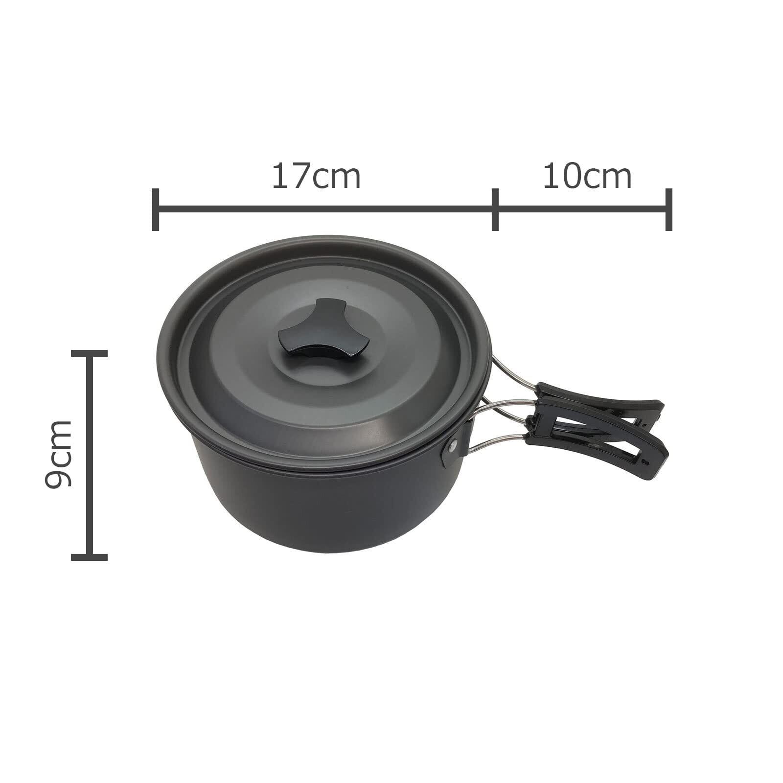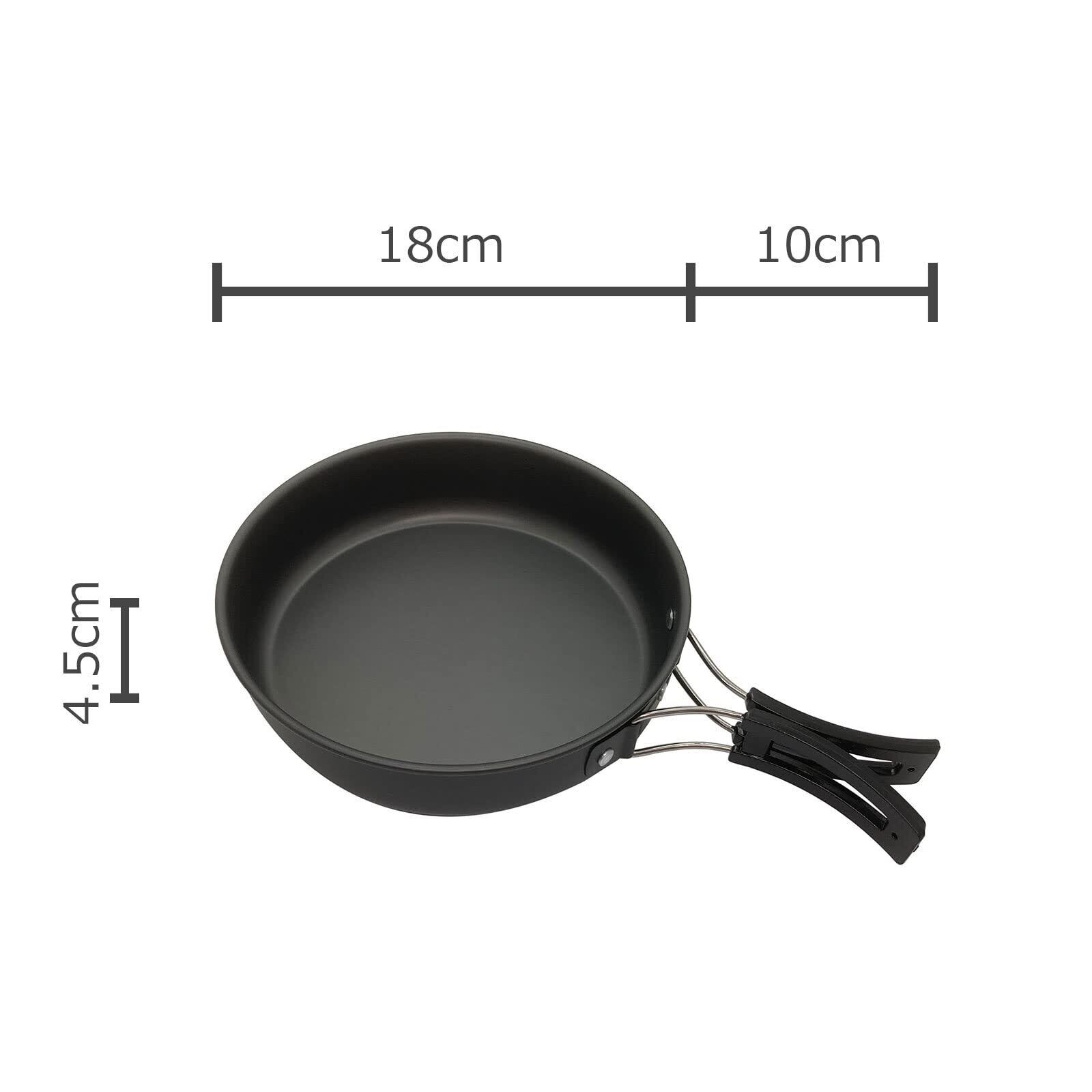 【調理鍋】直径17cm×高さ9cm、容量1.8L、【フライパン】直径18cm×高さ4.5cm、持ち手10cm、容量0.7L、【ケトル】 直径15cm×高さ8cm、容量1.1L、【スプーン】160×40(mm)、【ナイフ】165×12mm、【フォーク】160×12mm、【箸】18.2cm(9.4cm)、重量: 810g 、梱包サイズ:18.5×12.3×18.5cm、【材質】アルミニウム合金、合成樹脂、ステンレス、生産国:中国