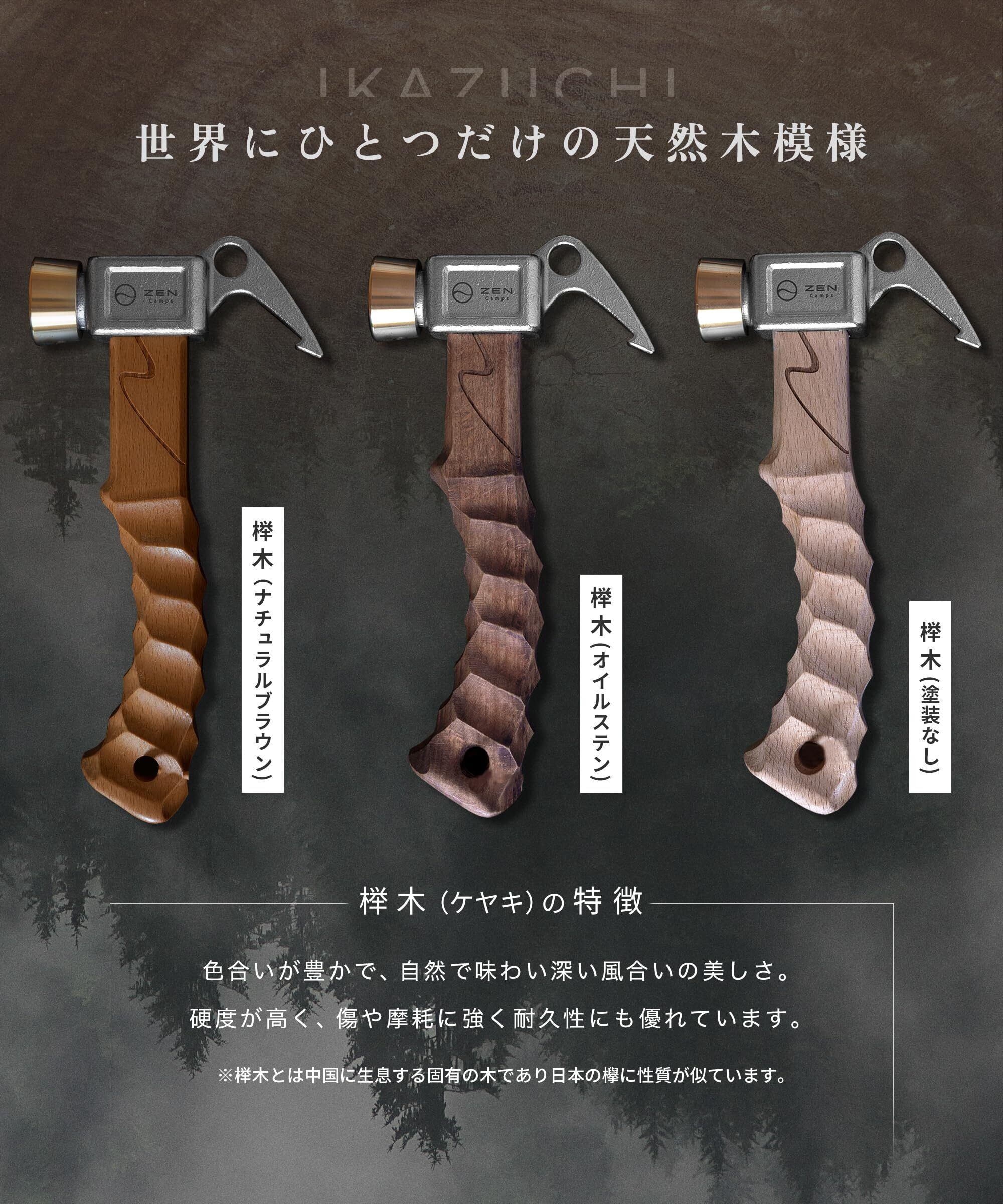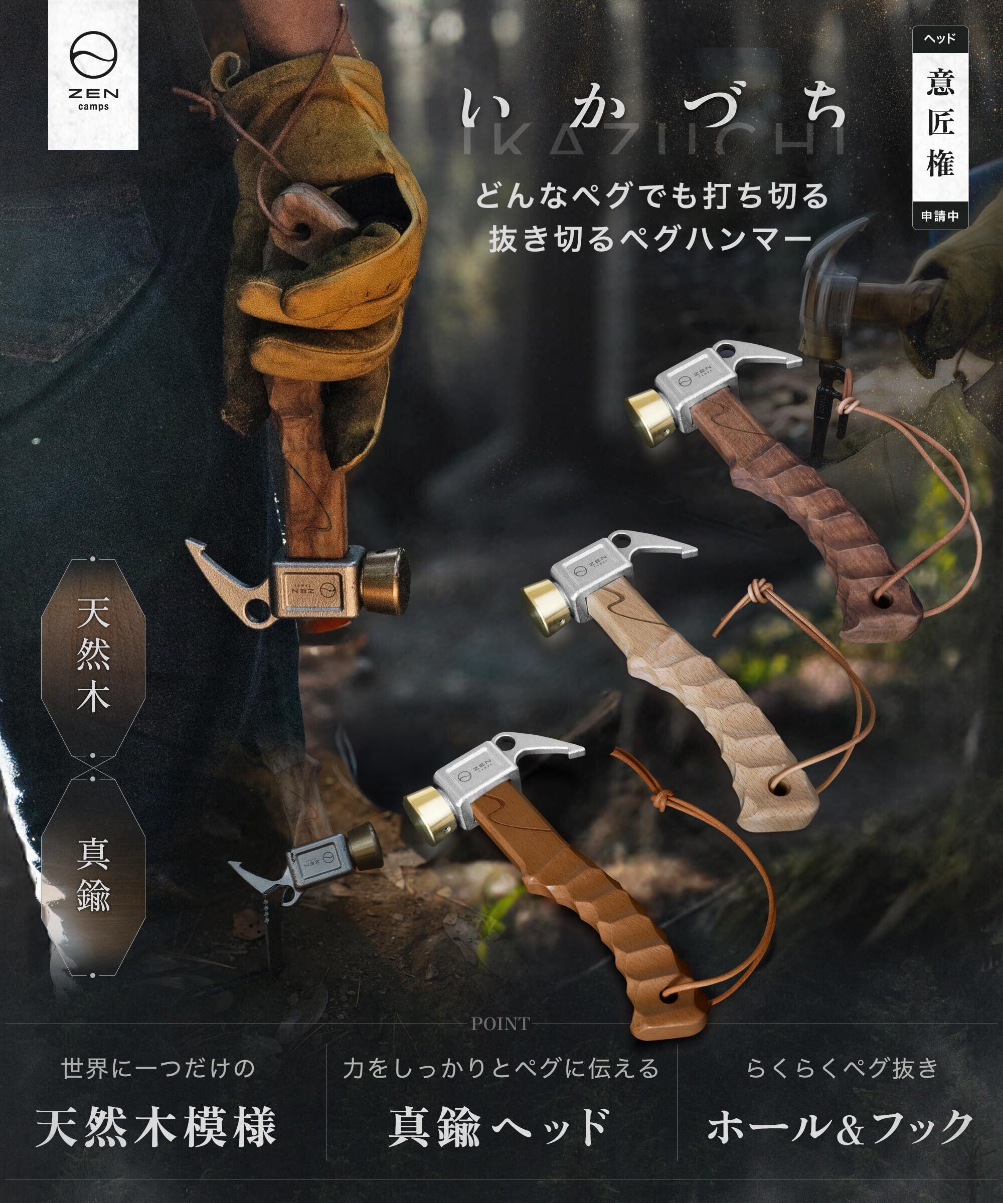 ZEN Campsペグハンマー 「IKAZUCHI」 手にフィットする名栗加工のハンドルと真鍮とステンレスの金属ヘッドを組み合わせることで、ペグをしっかりと打ち込めるショートハンマーです。