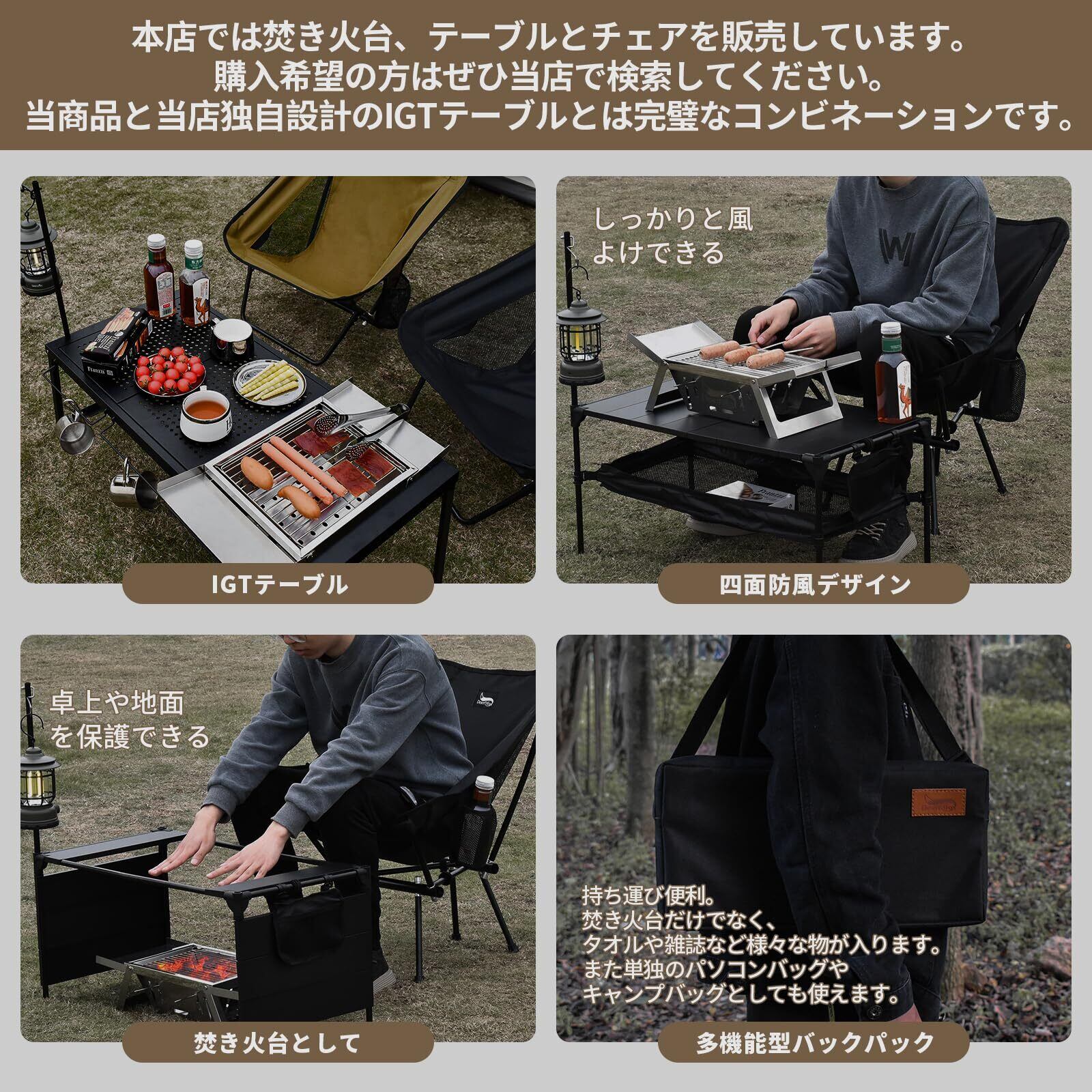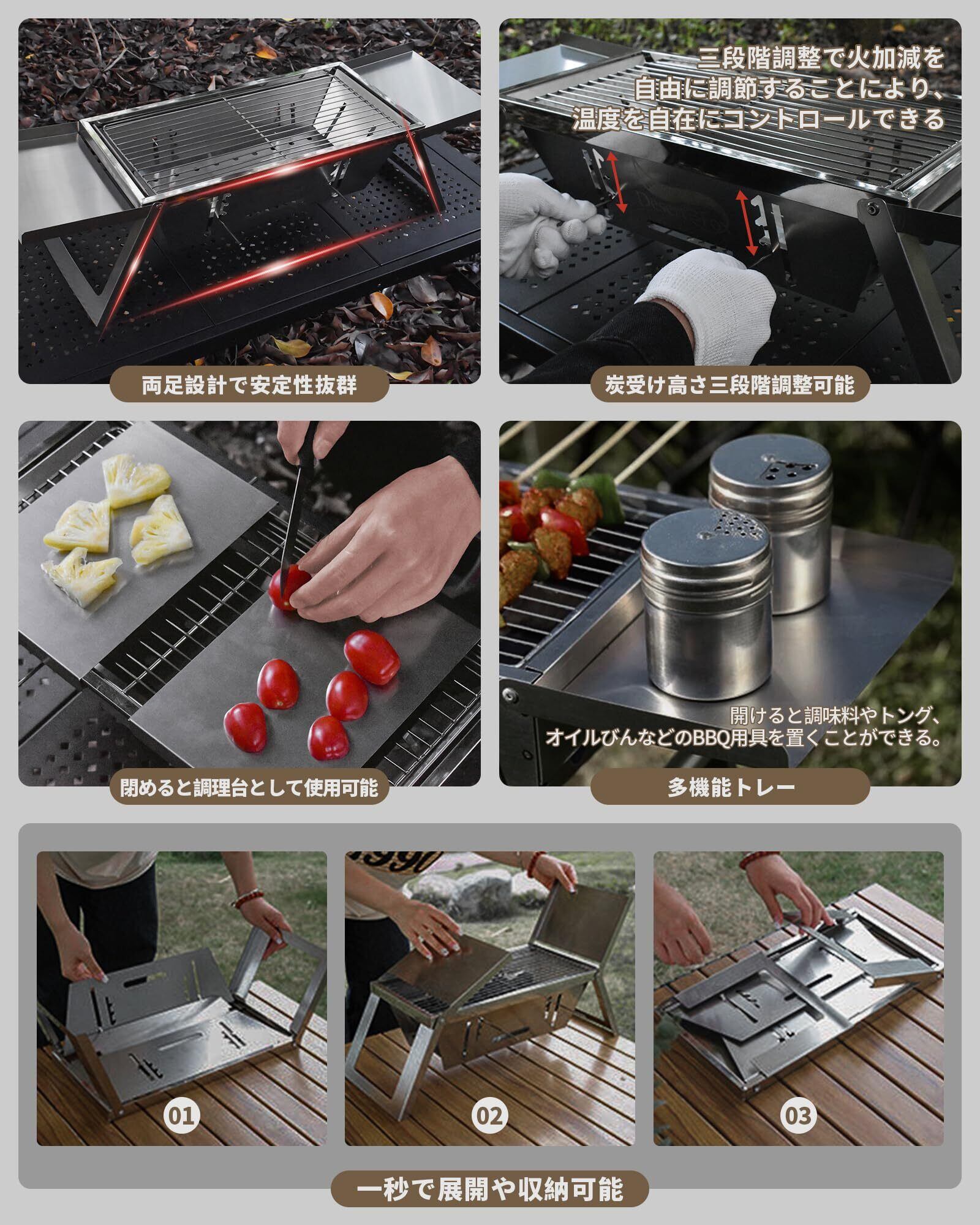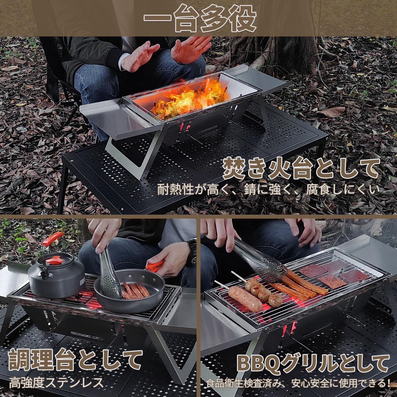 【1台で3役・調節可能】コンパクトなコンロでありながらも、たくさんの使い方法があります。バーベキューグリルや焚火台、調理台としても使用可能です。付属の網を乗せれば炭火でバ一べキュ一、調理器具を置いてキやンプ料理、網を外して薪を燃やせば焚き火台として使用できます。【両サイドに多機能折りたたみトレー】閉めると調理台やまな板として使用可能、開けると調味料やトング、オイルびんなどのBBQ用具を置くことができるトレーになる。油付けと調味などはより便利になる。