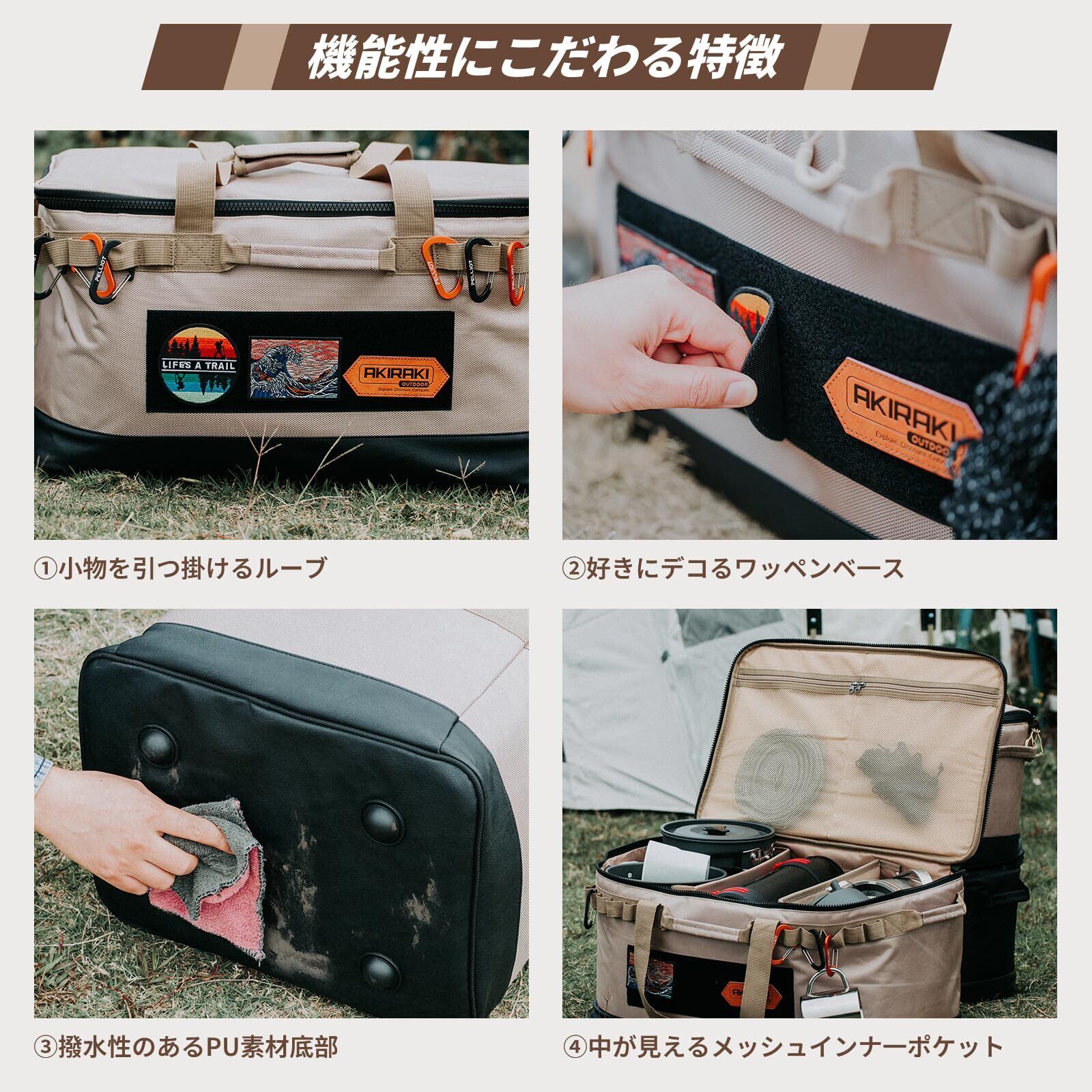 【収納力と携帯性】①前後にデイジーチェーンがあり、ガイロープなどを吊るせる。②開閉しやすい大型プラスチックファスナーを採用し、物の出し入れが簡単です。③蓋のファスナー付きポケットで小物が取り出しやすい。④2枚の仕切りはマジックテープで簡単に調整可能。⑤折りたたみ式で、省スペースで持ち運びも簡単。
