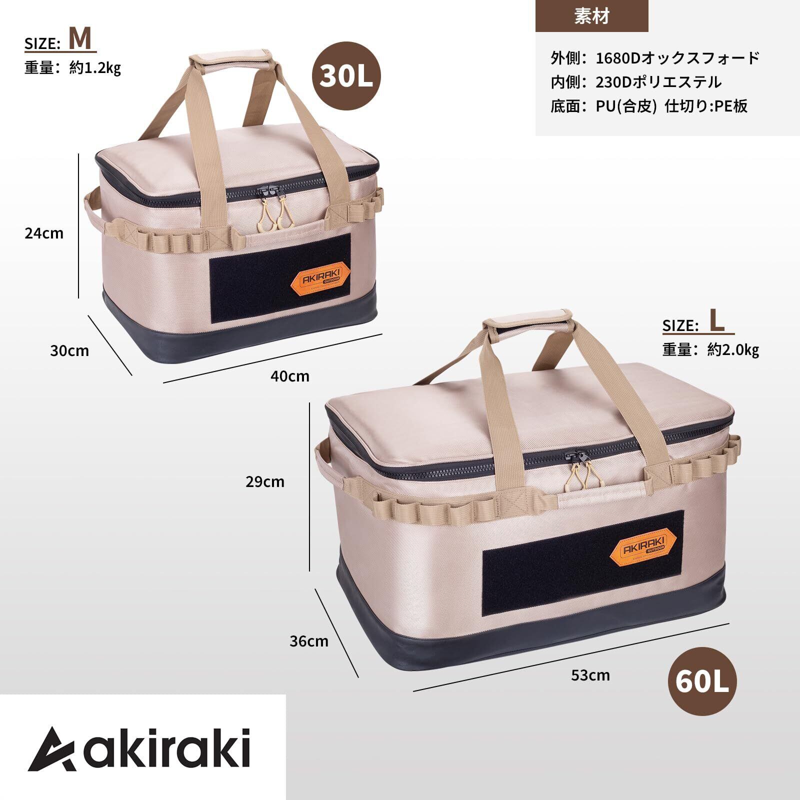 【30L/60Lボックス】Mサイズ:40×30×24cm(容量約30L、折り畳み時約41×33×8cm)、重量(約1.5kg)。Lサイズ:53×36×29cm(容量約60L、折り畳み時約54×38×5cm)重量(約2kg)。キャンプ 収納ボックスの付属品:仕切り板2枚。