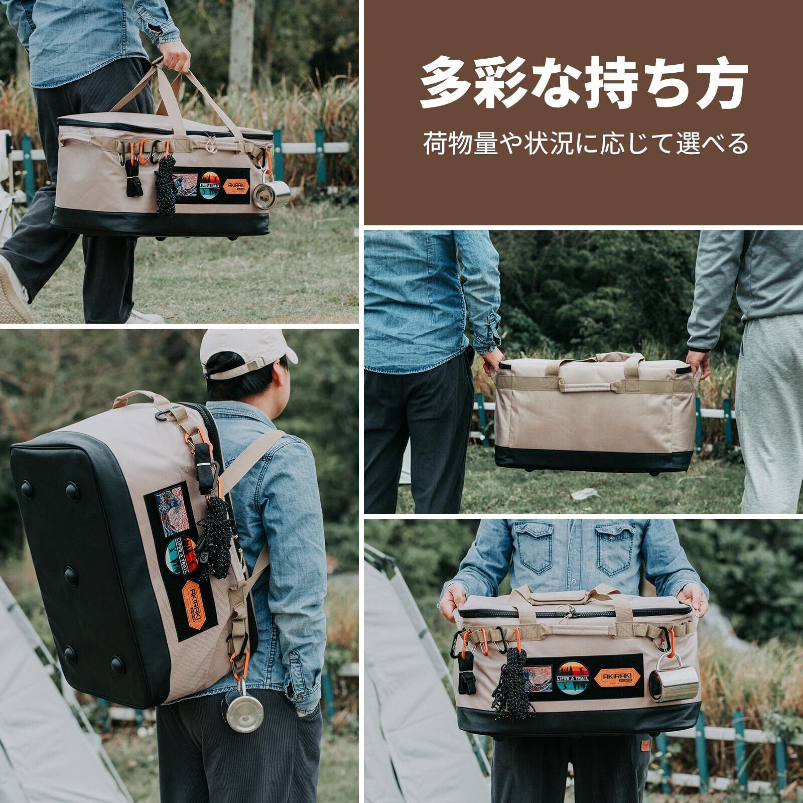 【大容量ツールボックス】キャンプ バッグはちょうどいいサイズで、手斧やペグ等の物はもちろん、焚き火台、薪ストーブ、湯沸かし、七輪、アウトドアコンロ等、キャンプに必要なものを沢山収納可能。その他キャリーバッグやゴミ箱としてもお使い頂けます。