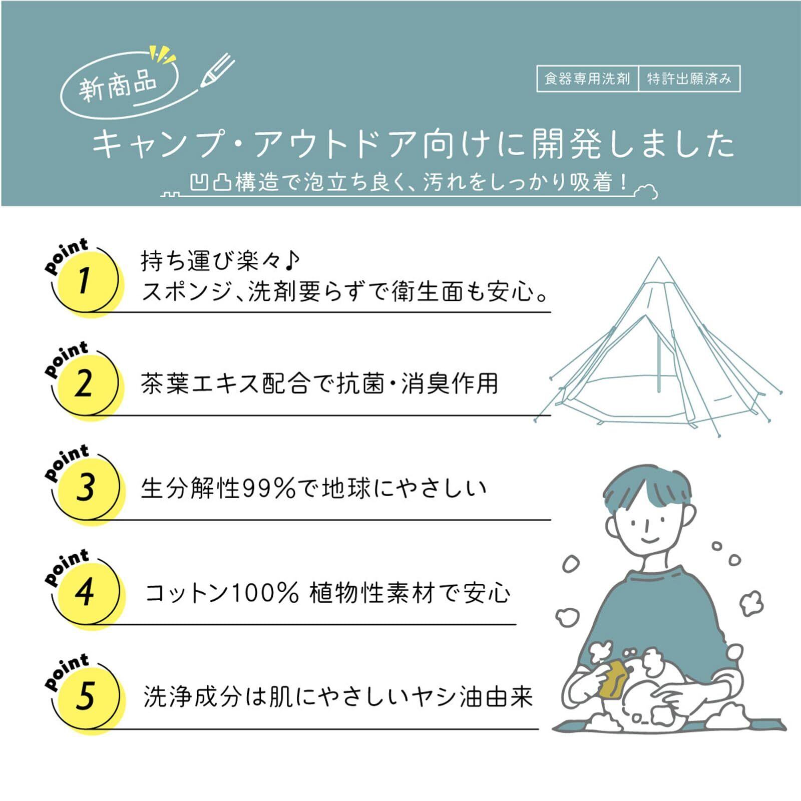 持ち運びが面倒なスポンジ、洗剤要らずでキャンプ等のアウトドアに便利。
