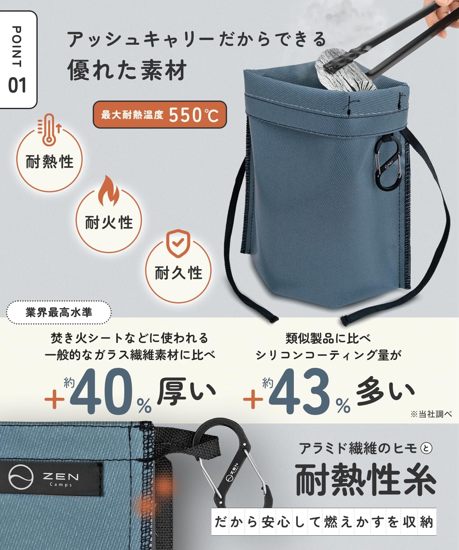 カラビナ付属モデルです! 【炭や燃えカス処理の悩みを解決!】アッシュキャリーは使用後の炭や薪の燃えカスを安心安全に持って帰れる耐熱性・難燃性の生地で作られた、火消し袋です。折りたたみ収納可能でコンパクトで携帯性が高く、今やアウトドアに必須のアイテム!キャンプやバーベキュー等焚き火終了後に完全に消化し、薪や炭を持ち帰れます。マチ付き自立型で耐熱性素材で作られており、まだ少し熱を持った使用後の炭や薪の燃えカスを入れたら、袋の口を締め内部を酸欠状態にする事で、緩やかで完全な鎮火を促し、安心安全に炭を持ち帰る事ができる炭処理火消し袋です。