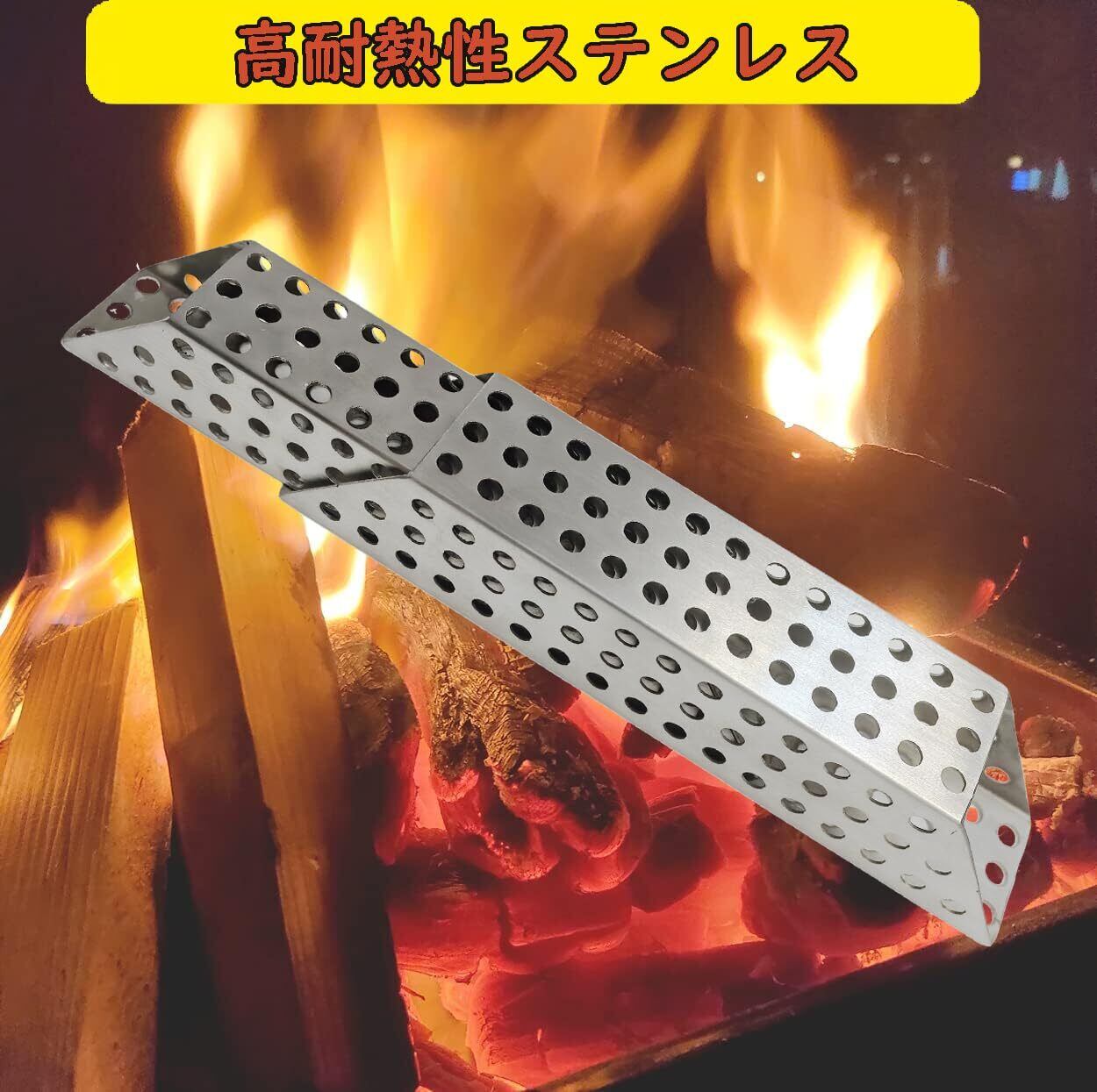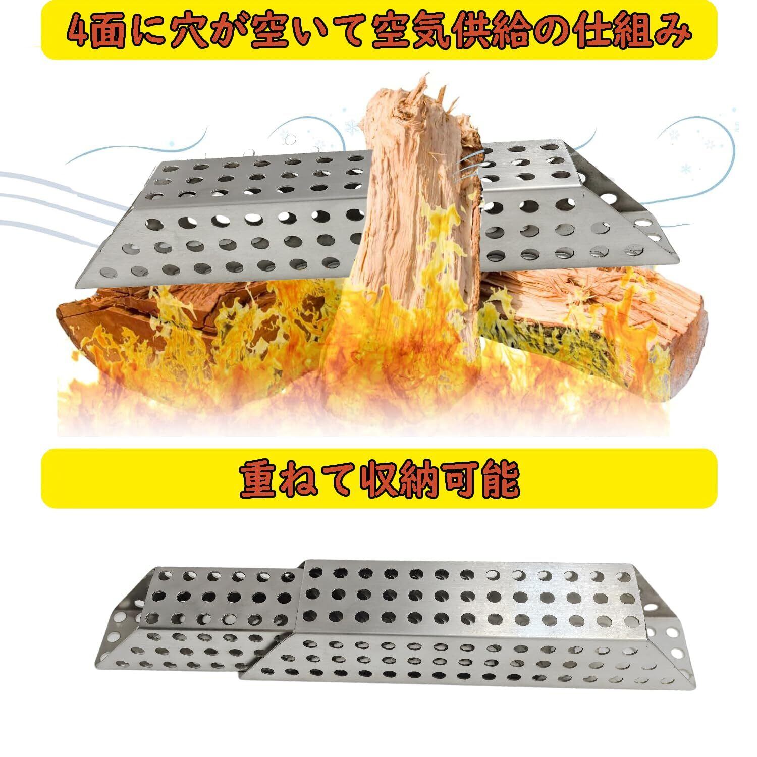 燃焼効率upメタル薪! 焚き火の薪に加えるだけで空気の通り道を確保でき、下方から空気を送り込み、スピーディーな着火と焚き火の燃焼効率をサポートできます。お手持ちグリルの火力が弱いとお悩みの方に。複数のロストルを部分的に重ねることができ、火床サイズを選びません。