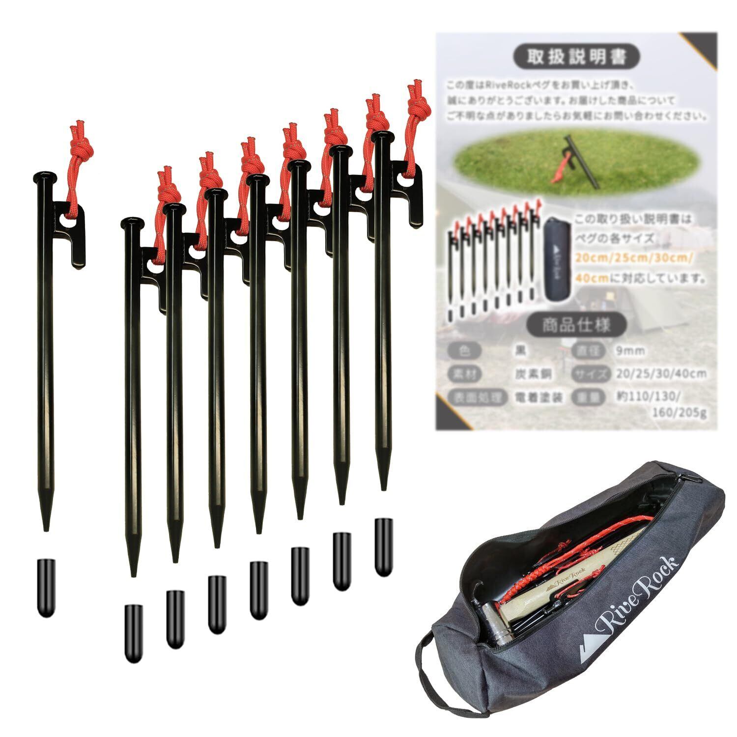 【在庫セール】RiveRock(リバロック) テント用ペグ 20cm 8本セット, 反射材付きロープ, 高炭素鋼製, 収納バッグ付き, キャンプ用品 ソリッドステーク S45Cスチールペグ 電着塗装 収納袋 キャップ (20cmペグ8本収納バック) | paghag