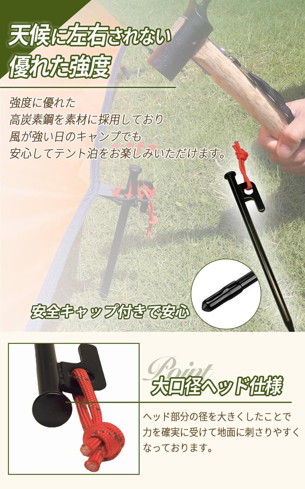 優れた汎用性: 砂利や石混じりの固い地面でも深く打ち込め、テントやタープの確実な設営が可能