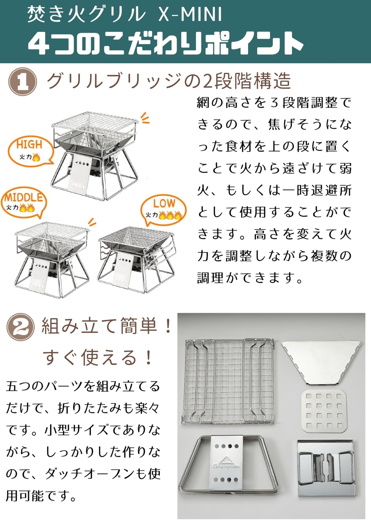 キャンピングムーン(CAMPING MOON)焚き火グリル 焚き火台 世界最小 コンパクト 焚き火 グリル 帆布ケース X-MINI