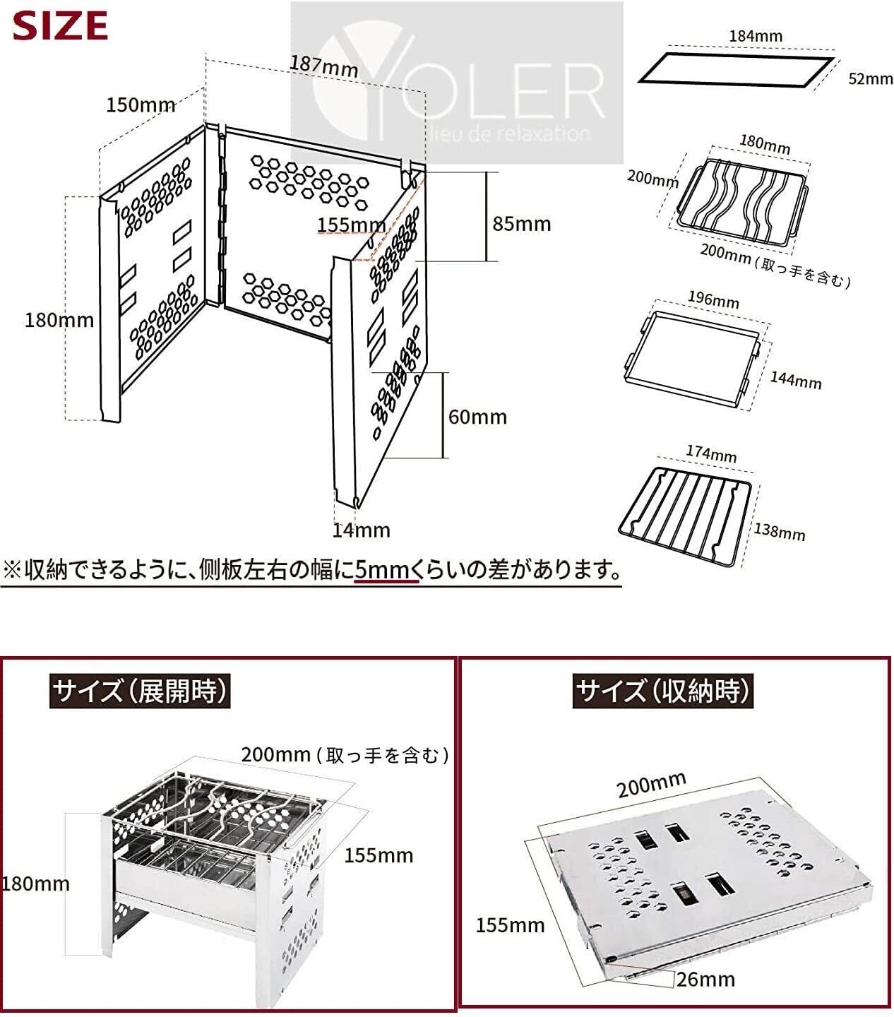 【YOLER保証】お客様が安心にご利用いただけるようご購入日から、1年の保証期間が設けています。初期不良対応期間は商品到着日から30日間です。初期不良対応期間内に、万一製品の不具合(故障、破損など)や部品不足などございましたら、無償にてお取替えをさせていただきます。必ず[出品者]にお問合わせください。 【要注意】・コンパクトに収納できるため、本体右と左のパネルの奥行きが5mmほど異なる、炭受けプレートを取り付けると、中央のパネルとの隙間が 両側異なります。・傷防止のため生産中ステンレス表面にビニールが付着されます。包装時は人工的に除去するのでビニールの跡などが残る場合があります。・一部の部品は人工的に溶接されてます。少し溶接の痕跡があり、何どうぞご了承ください。もし溶接口が折れた場合は[出品者]にご連絡ください。無償にてお取替えをさせていただきます。