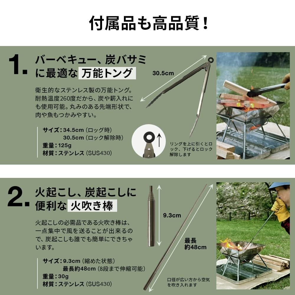 【充実の付属品】 トング、火吹き棒、焼き網、収納ケース、日本語の説明書付き。付属品全てケースの中に収納できます。サイドポケットには、トングや網は本体と別々に収納できるから、汚れが付かず衛生的。
