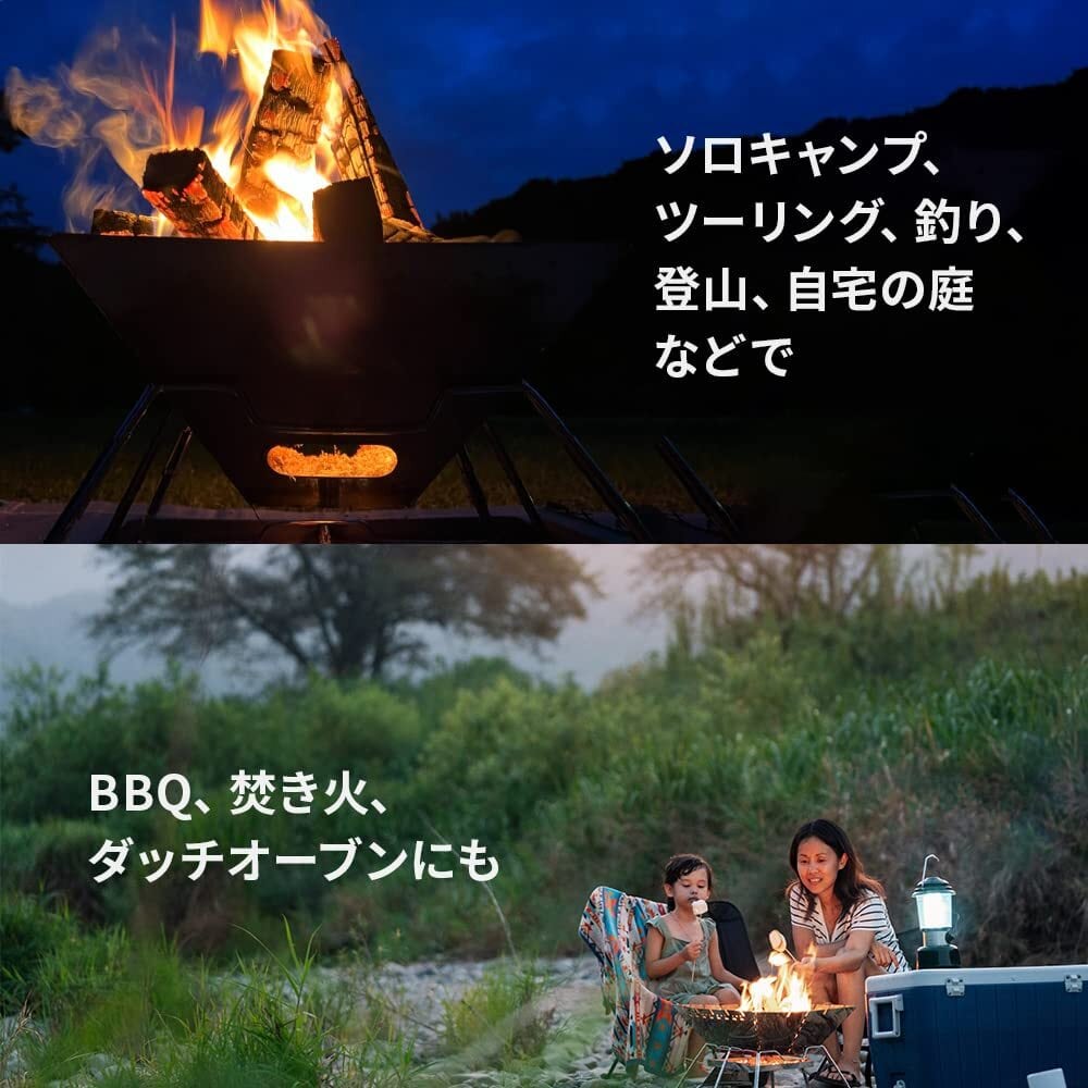 【バーベキューに、焚き火に】付属の網をのせ炭火でBBQ、薪をのせれば焚き火台としても使用できます。直火が禁止の場所でも下皿が芝生保護代わりに代用できるのでとても便利。アウトドア用品の定番です。