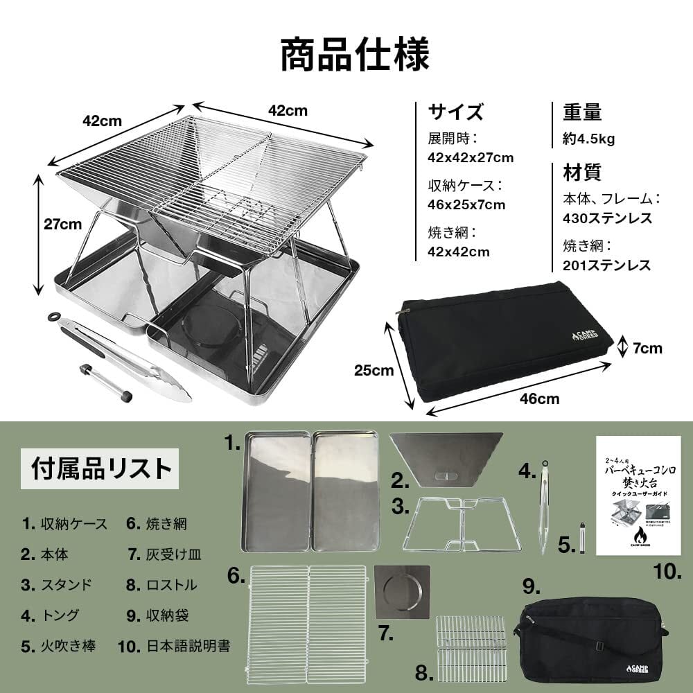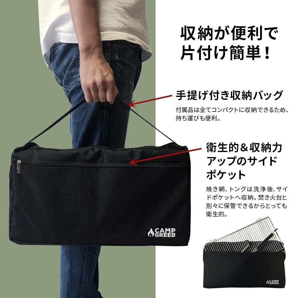 キャンプグリーブ 【国内ブランド】 バーベキューコンロ 焚き火台 ファミリーキャンプ 4-6人用 42D x 42W x 27Hcm コンパクト 折りたたみ トング 火吹き棒 炭バサミ ステンレス製 サイド収納