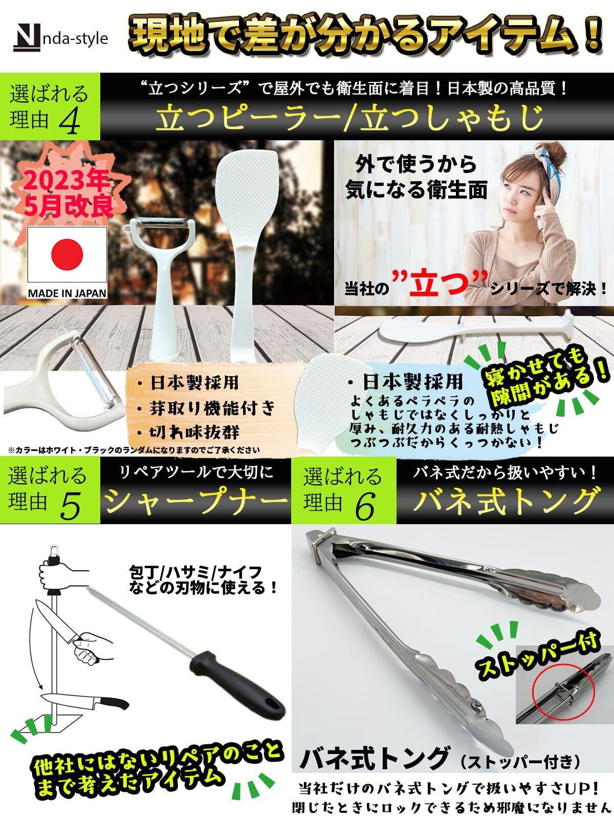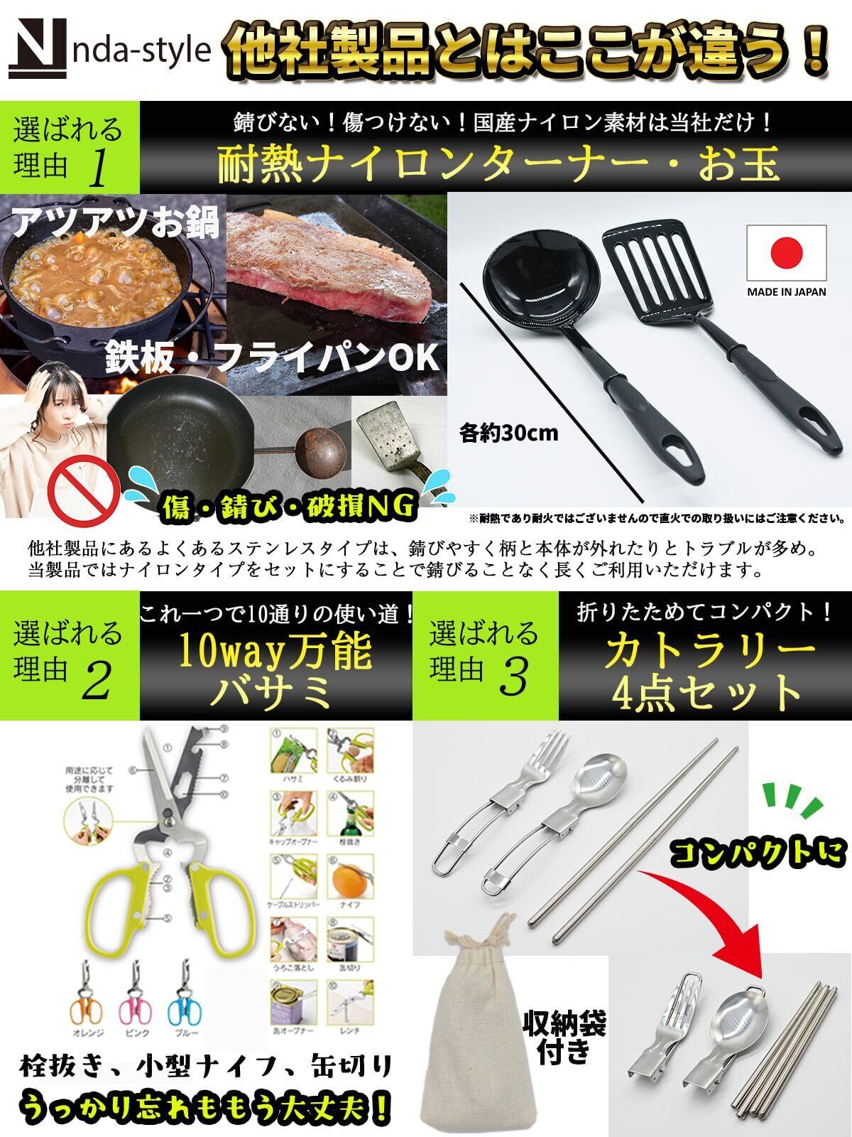【特徴】万能バサミ/10通りの使い方ができる多機能なハサミです。缶切りや栓抜きなどの代用も可能でこれ一つで小物を減らせます。立てれるしゃもじ/屋外でも衛生面に配慮したしゃもじです。置き場所に困った時など◎