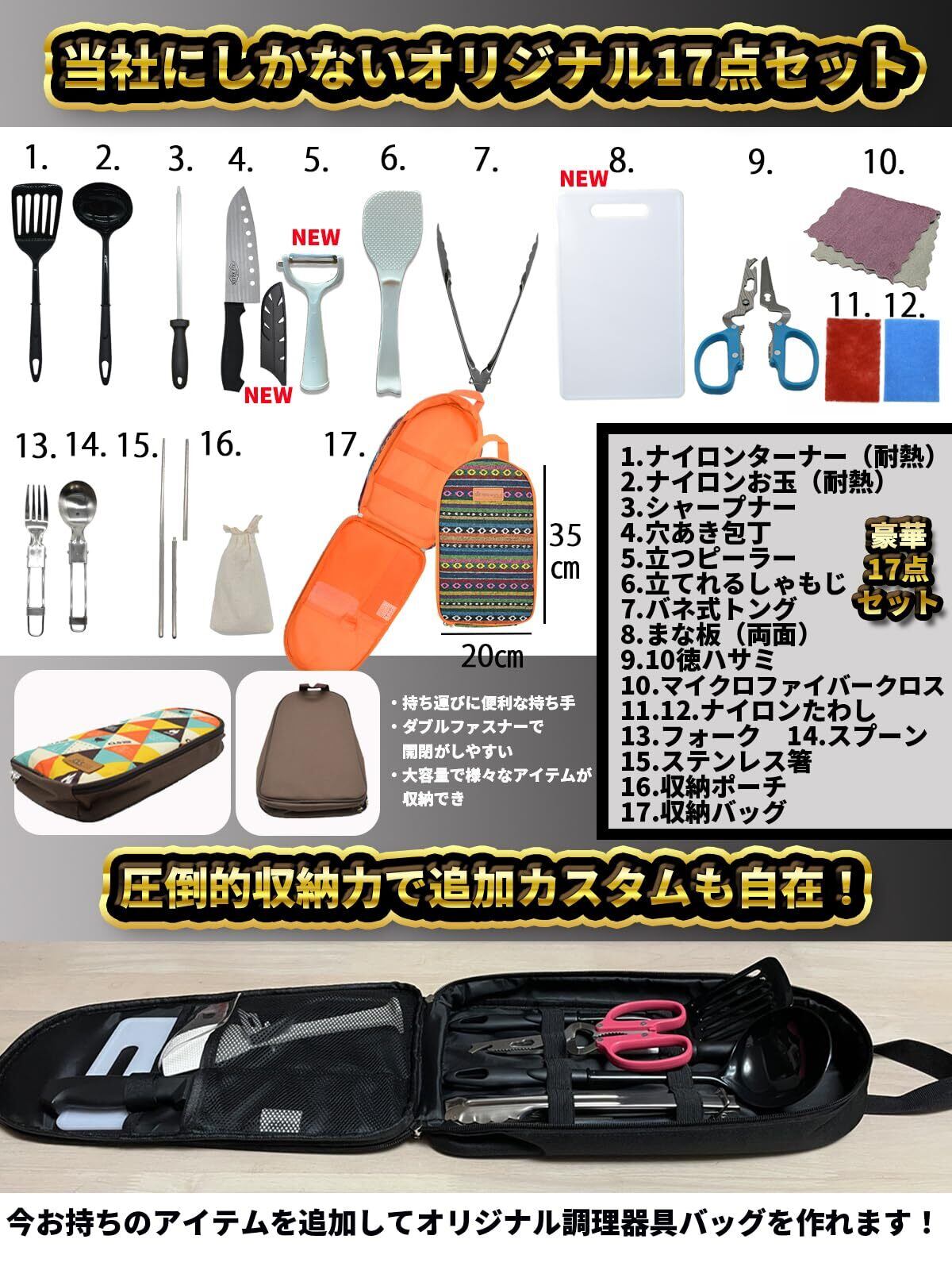 【ベーシックモデル17点セット】【コンプリートモデル20点セット】これ一つでバーベキューは完結!クッキングツールベーシックモデル17点セット/コンプリート20点セットです。 キャンパーの声を集め、キャンプで役立つものをだけを厳選したツールバッグです。