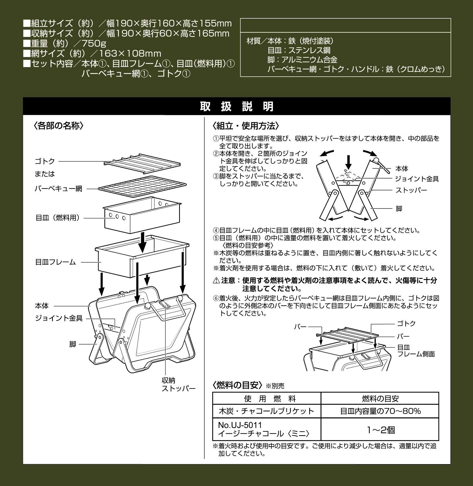 セット内容:本体1、目皿フレーム1、目皿(燃焼用)1、バーベキュー網1、ゴトク1