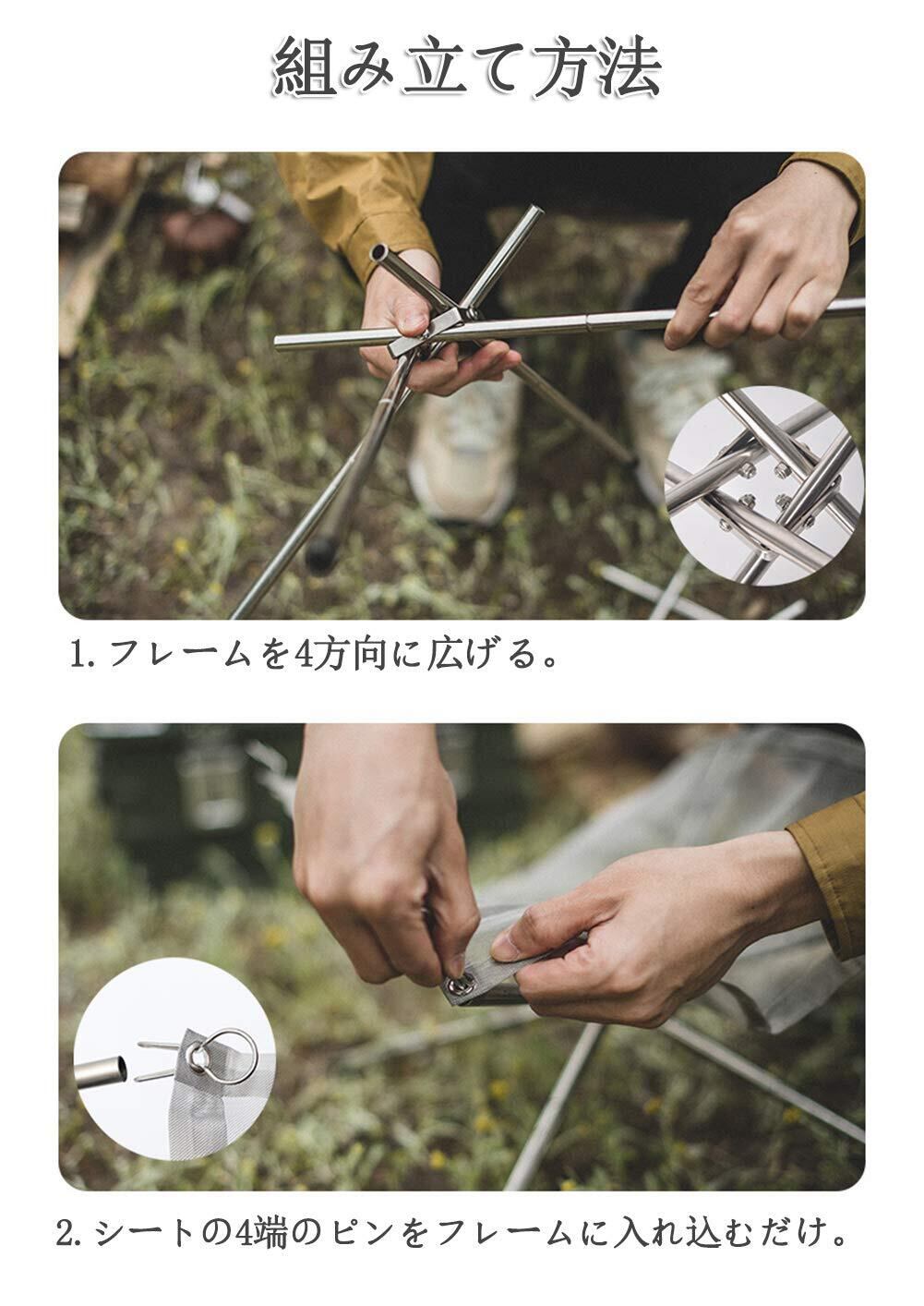 【サイズ】使用サイズ:約41.5×41.5×34cm 収納サイズ:約10×10×24cm 【材質】ステンレス鋼 【重量】800g 【バッケージ】収納バッグ、スタンド、脚8本、メッシュシート2枚、ピン8個