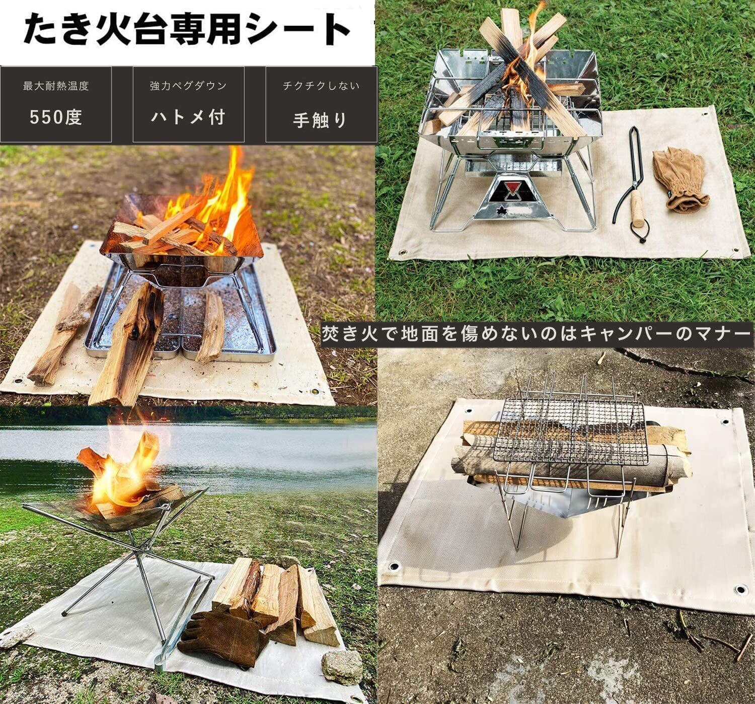 【多用途】直火禁止キャンプ場での焚き火台用ベースシートとして、また、卓上やテント内での バーナー使用時にご使用いただけます。バーベキュー焼肉や卓上コンロの防火に!芝生を保護する目的で焚き火台の下に敷いてます。溶接火花養生シート、各種防火遮断シート、バーナーシート、耐炎カバー類として自由にご使用いただけます。※必ず耐熱温度内でご使用ください。また断熱シートではないため地面への熱を遮断できるわけではありません