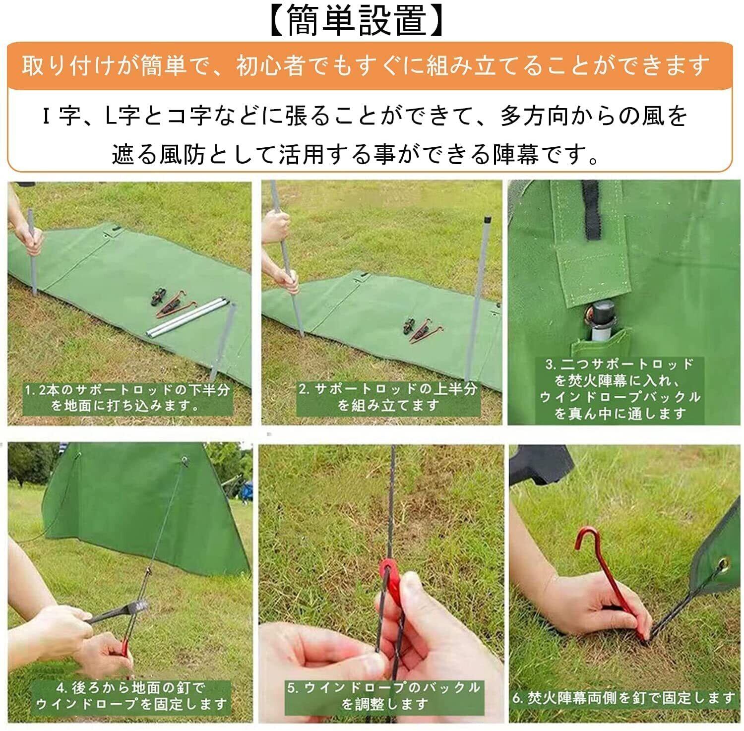 【焚き火陣幕】展開サイズ:上部80cmx底部165cmx高さ60cm、厚さ:約0.06mm。風除け陣幕は難燃性と耐久性に優れた有機シリコンコットン帆布製を採用しています。注意点:使用の時陣幕はキャンプファイヤーから一定の距離を保つ必要があります、15-20cmぐらいはおすすめです。