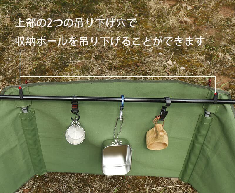 【セット内容】有機シリコンコットン帆布製陣幕x1(上部80cmx底部165cmx高さ60cm)、アルミニウム合金製ポールx2(46x0.9cm)、アルミ六角形ペグx4(18cm)、アルミ合金風ロープバックルx2(3.9x1.5cm)、収納専用袋(27x12cm)、セット総重量:880g