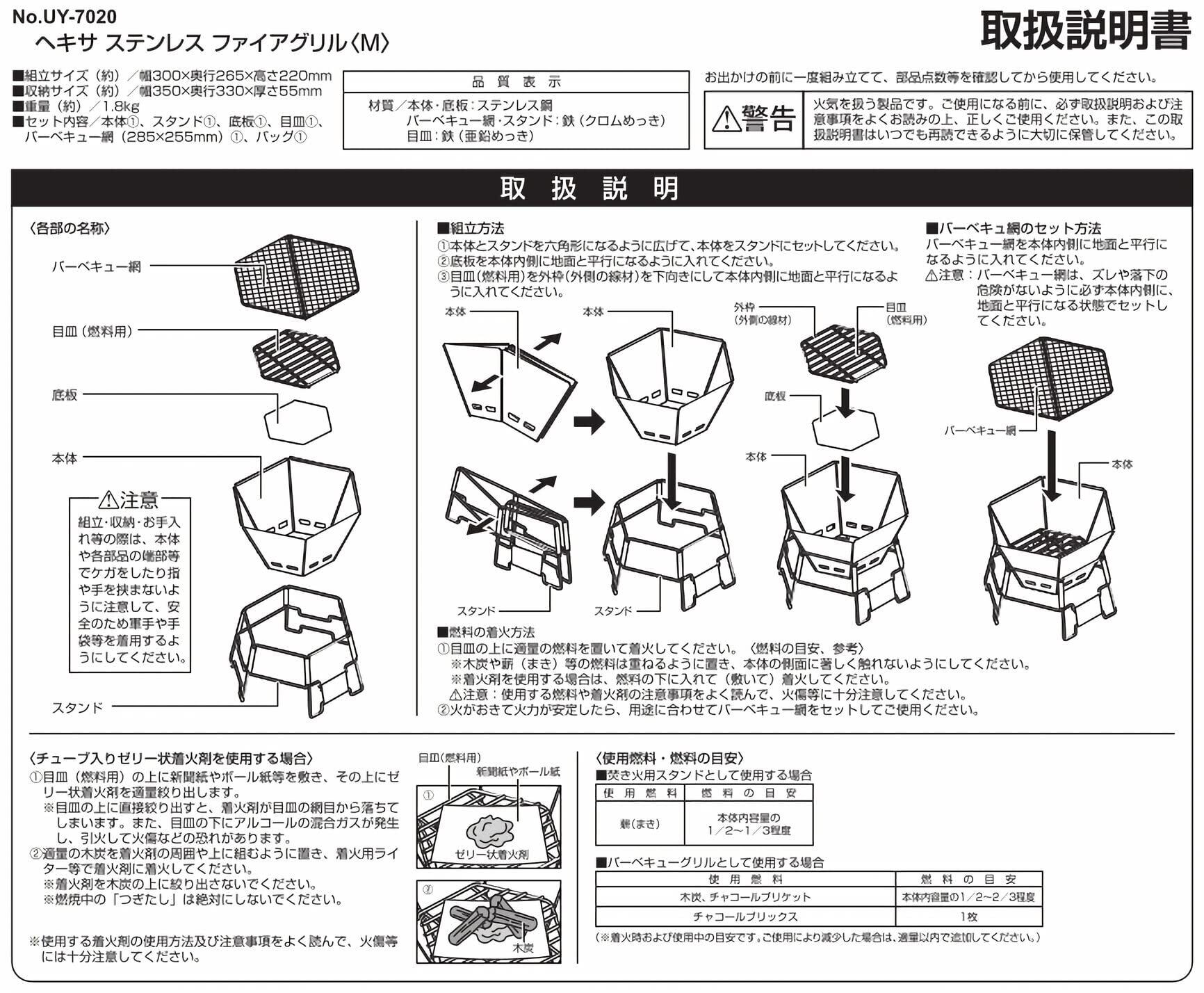 1台2役! 焚き火とアミ焼きバーベキューが両方楽しめます。コンパクトサイズ! 2~4人用。組立簡単! スタンドと本体を広げてセットするだけの簡単構造。薄型コンパクト! 収納は薄型でコンパクトに折りたためます。錆びにくいステンレス製! 収納バッグ付き! 持ち運び・収納に便利。組立サイズ:(約)幅300×奥行265×高さ220mmアミサイズ:(約)285×255mm収納サイズ:(約)幅350×奥行330×厚さ55mm製品重量:(約)1.8kgセット内容:本体×1、スタンド×1、底板×1、目皿×1、バーベキュー網(285×255mm)×1、バッグ×1材質:本体・底板/ステンレス鋼、バーベキュー網・スタンド/鉄(クロムめっき)、目皿/鉄(亜鉛めっき)原産国:中国レンタル等による貸出、オークション等による販売や中古販売、及び譲渡によって発生した故障・破損・損害・事故などにつきましては一切責任を負いかねますので予めご了承ください。