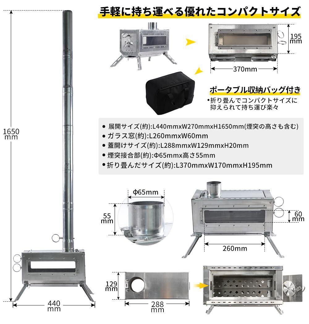 サイズ:使用時は(約)L440mmxW270mmxH1650mm(煙突の高さも含む)、収納時は(約)L400mmxW185mmxH265mmなコンパクトサイズに抑えられて、ポータブル収納バッグ付き持ち運び楽々。