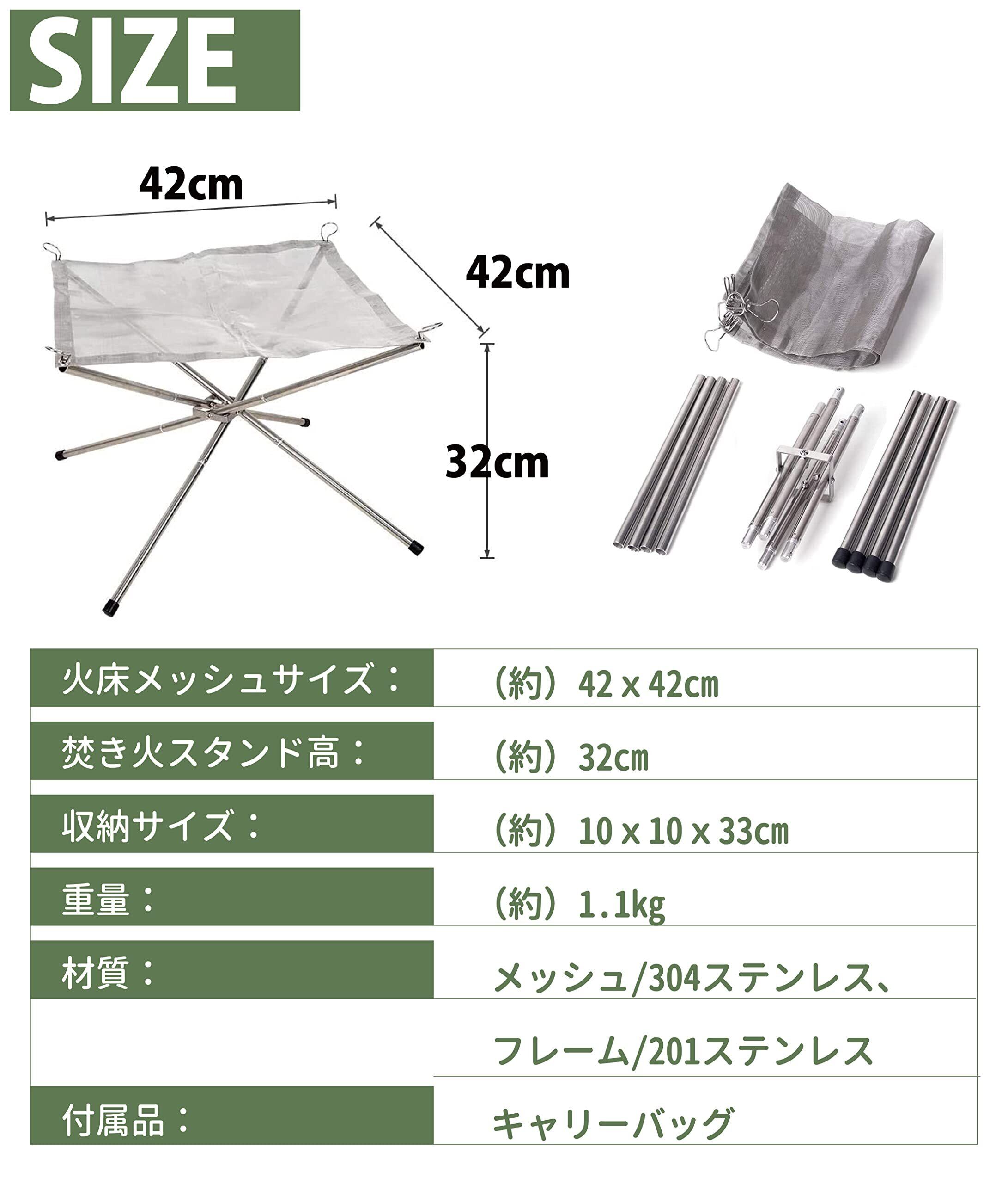 【商品仕様】焚火台収納サイズ約10×10×33cm、展開サイズ約42×42×32cm(スタンド高さ)、重量約0.6kg、キャリーバッグ付き。