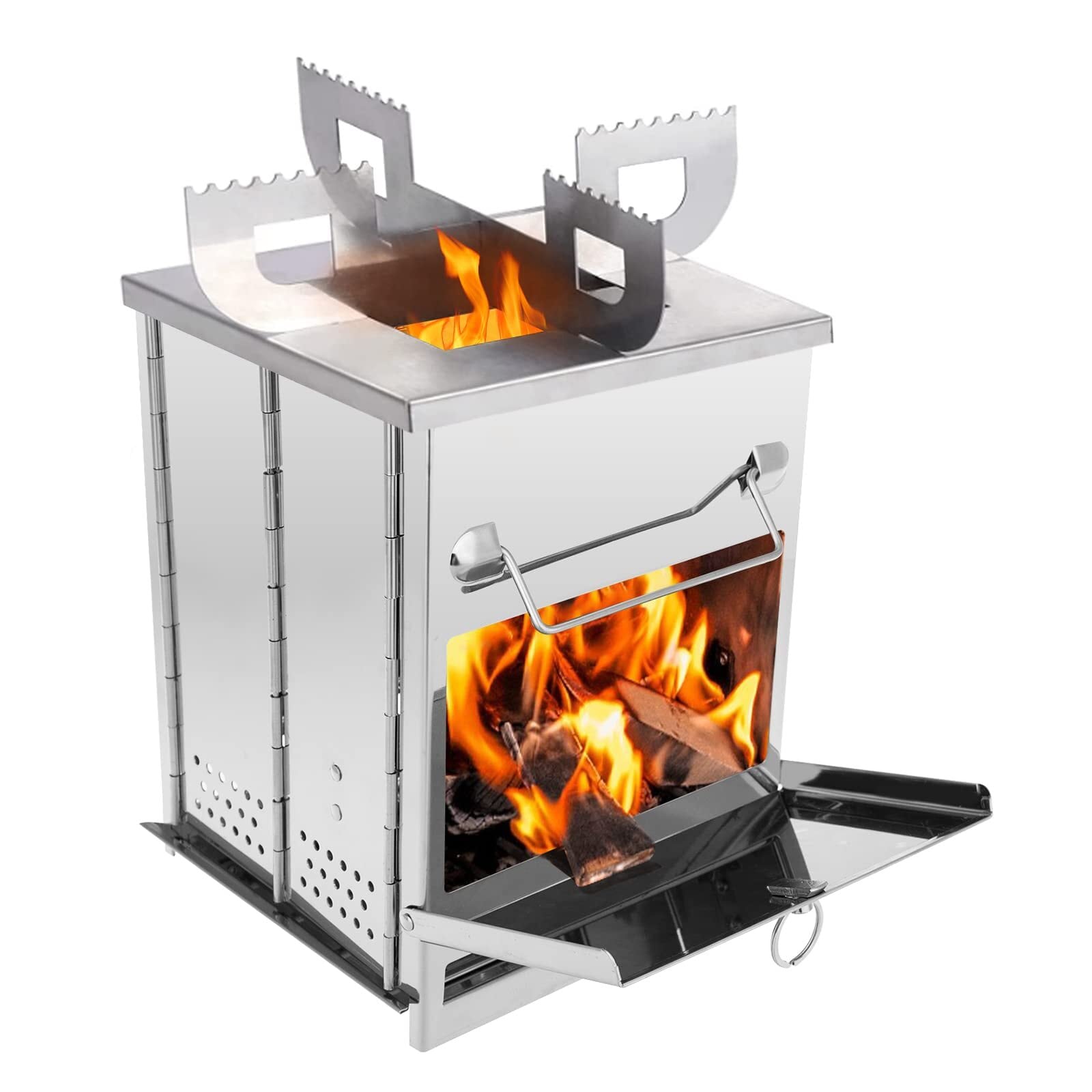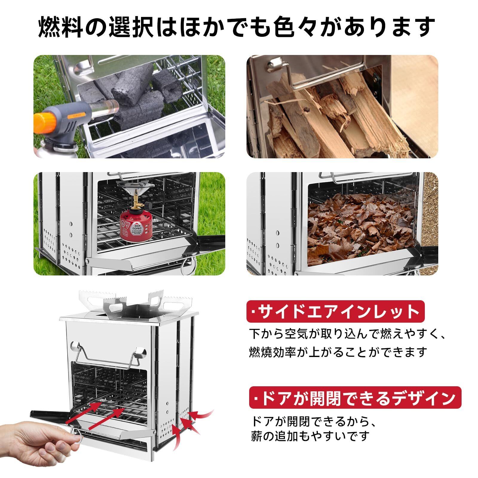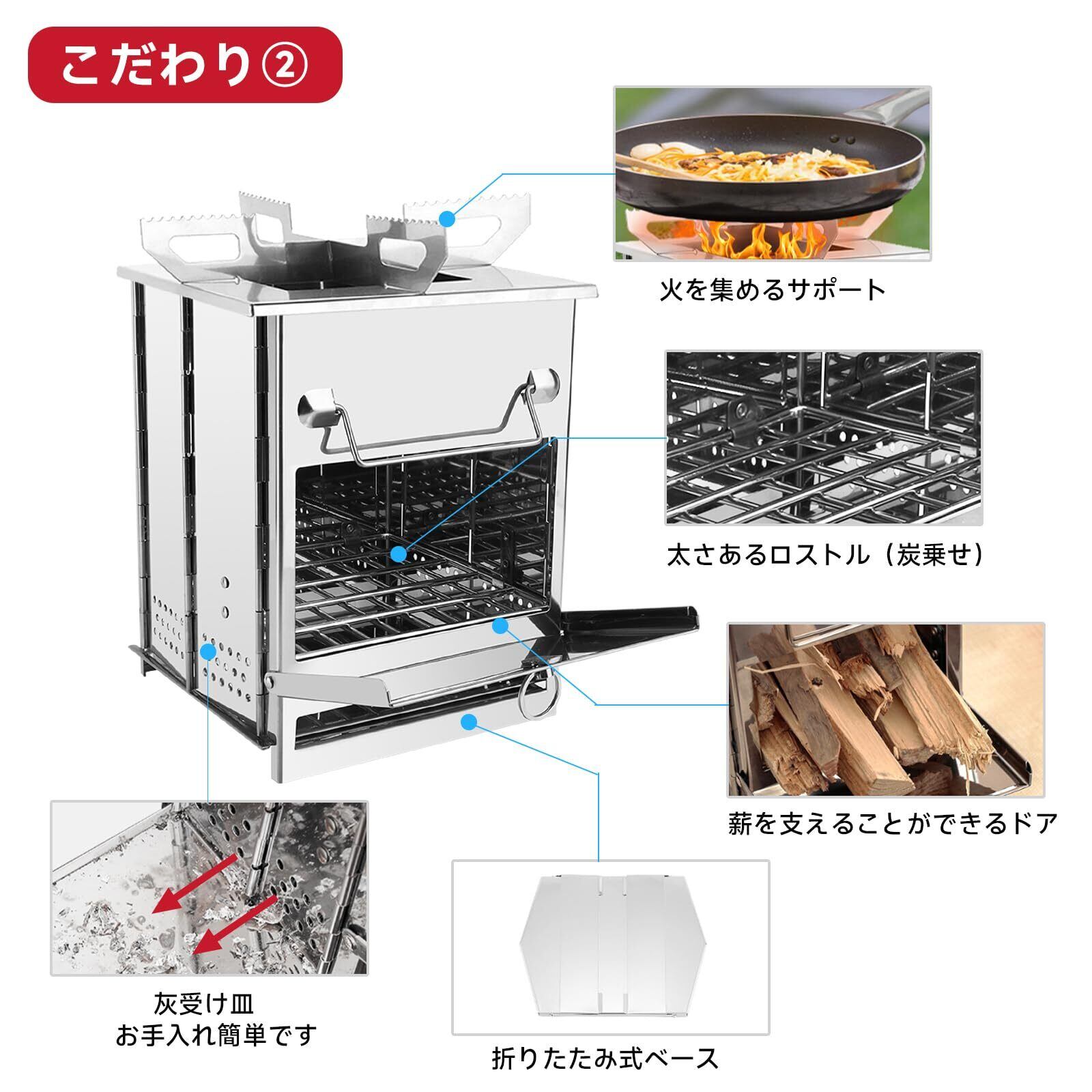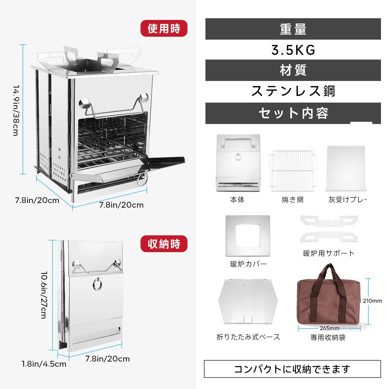 【ソロ&軽量】ポータブル薪ストーブの組立サイズ(約):21cm * 23cm * 38cm 重量:約3.5kg 付属品:①焼き網*1、②炭受けプレート*1、③暖炉用サポート*1、④折りたたみ式ベース*1、⑤暖炉カバー*1、⑥収納ケース付き*1。軽量でソロ キャンプ、アウトドア活動には最適です。