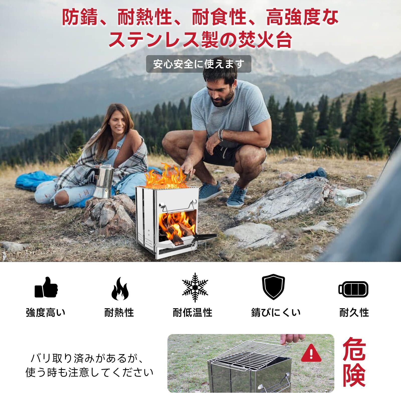 【ステンレス&お手入れ簡単】耐久性、耐高温性と耐食性抜群のステンレスを使用し、錆びにくい焚き火台です。灰受け皿付きで、初心者でも扱いやすく、お手入れ簡単です。
