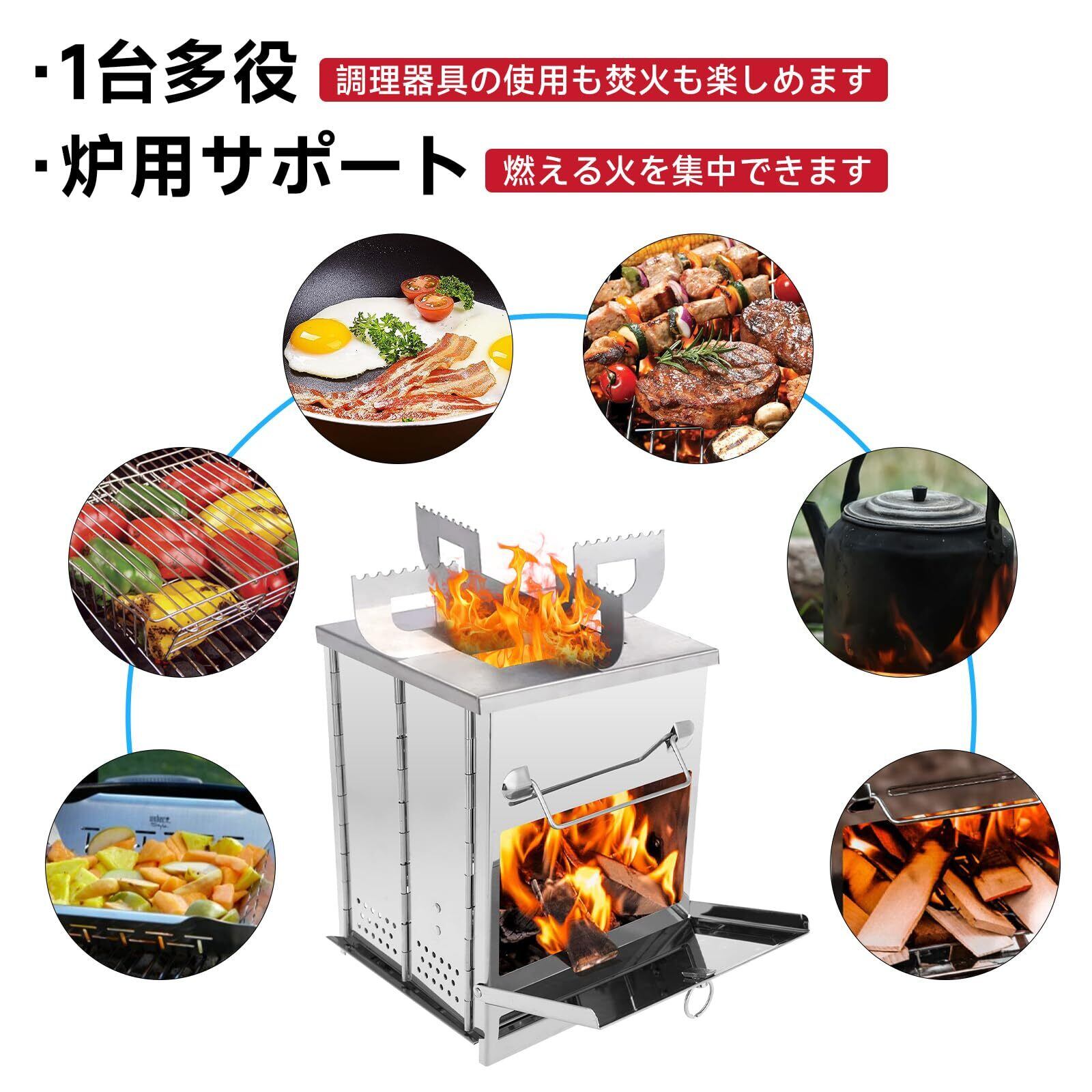 【サイドエアインレット&1台多役】バーベキューコンロの周りの空気がサイドエアインレットから入り燃焼しやすく、燃燒効率が上がることができます。また、調理器具を使って焚火飯だけでなく、焚き火を楽しむこともできます。
