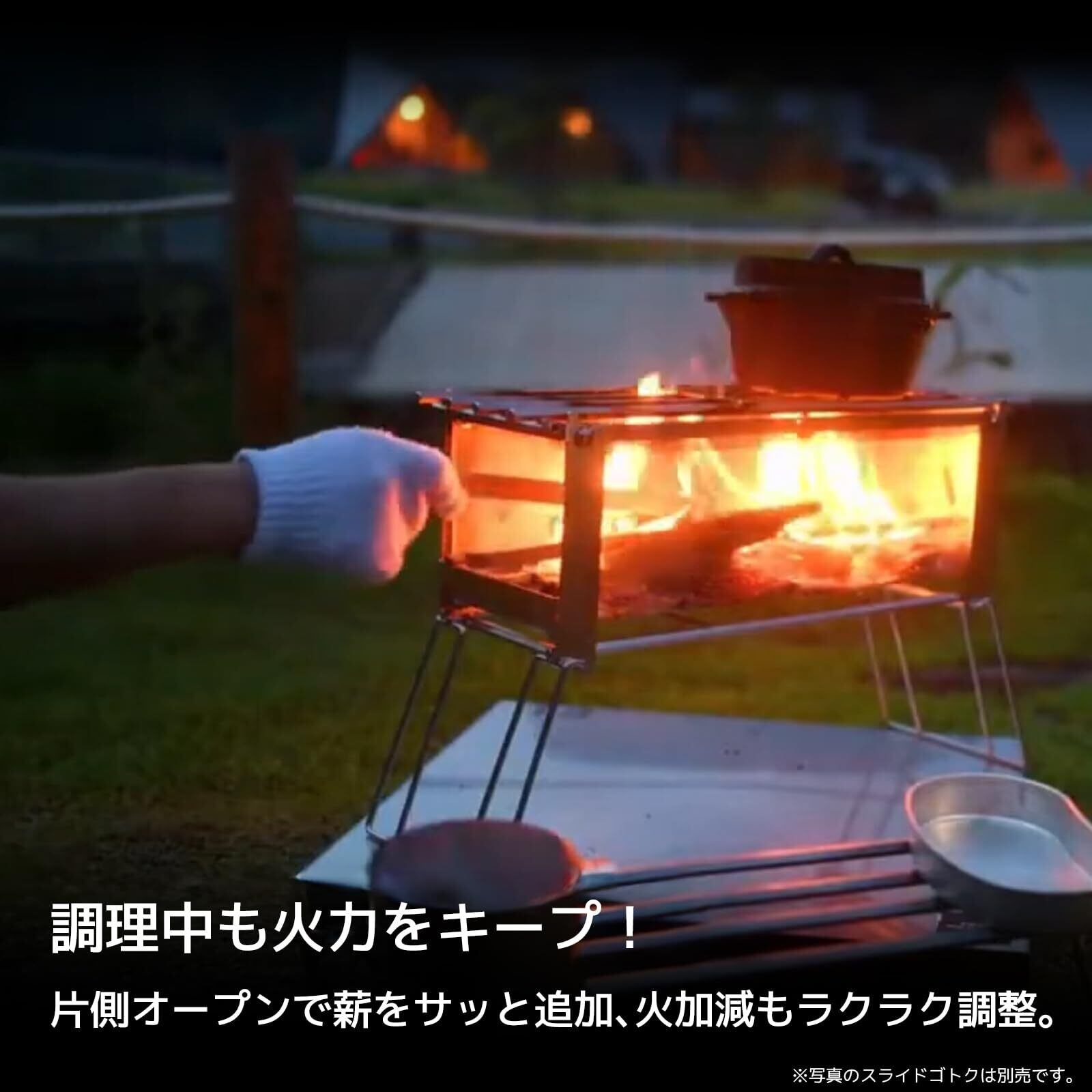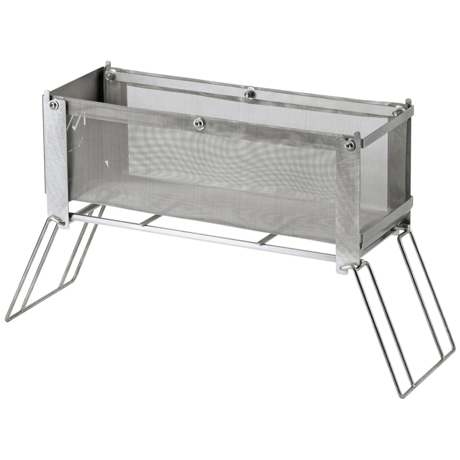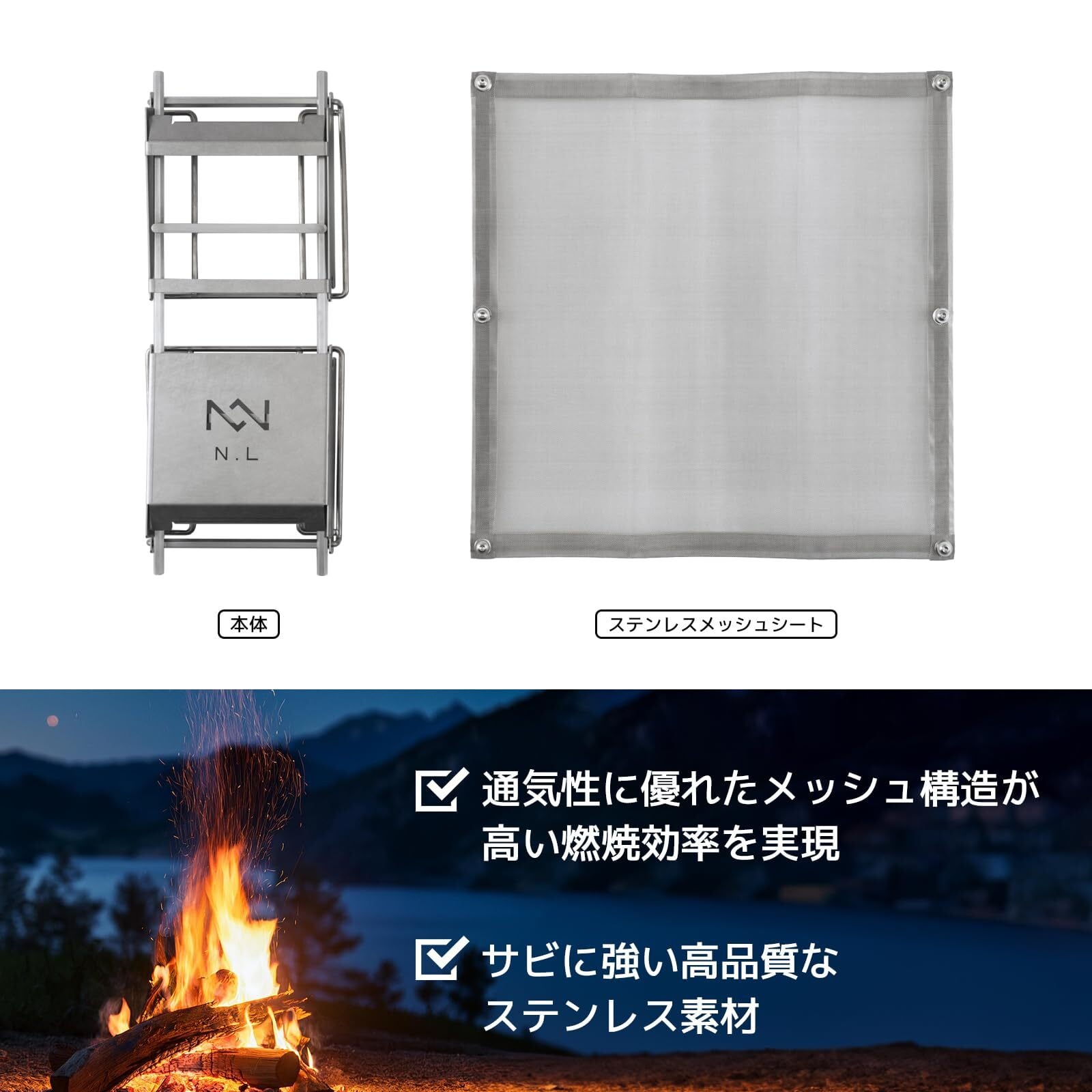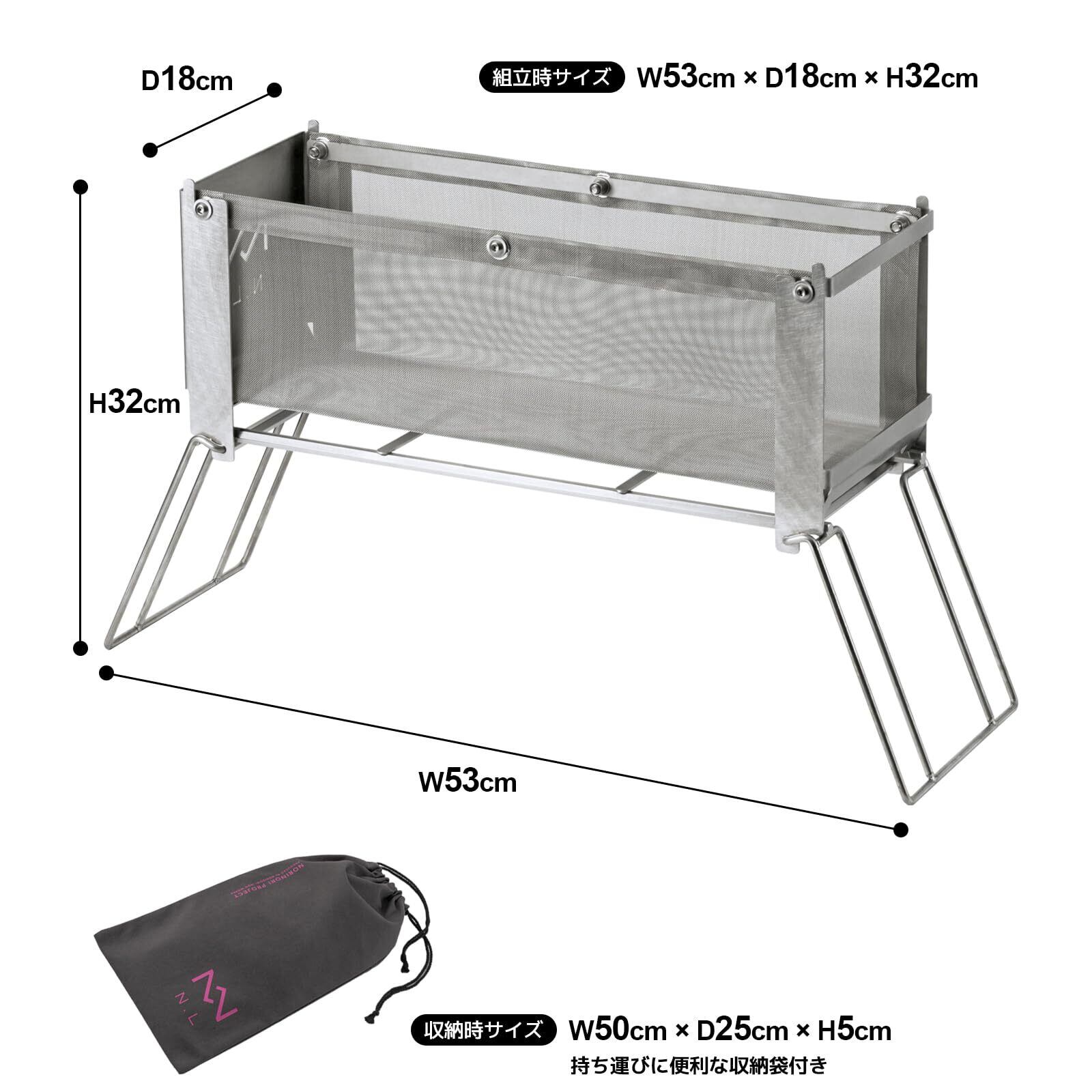 鉄工職人のアイデアから生まれた、炎を見つめる焚き火台。軽量でありながらもゴトクと組み合わせることでダッチオーブンなどを使った本格的な焚火飯ができる、有りそうで無かったプロダクトです。 <組み立てた時のサイズ> W53cmXD18cmXH32cm <袋に入れた時のサイズ> W50cmXD25cmXH5cm <材質> 本体・サイドバー・脚部:ステンレス(SUS304) / メッシュシート: ステンレス(SUS304) ※ハトメはアルミ製 / 巾着袋:綿 / ロゴステッカー:強光沢紙(耐水) <重量> 1.8kg