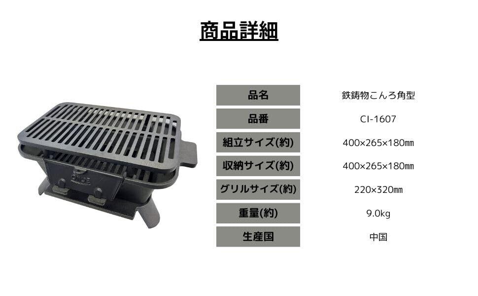 【在庫セール】尾上製作所(ONOE) 鉄鋳物こんろ角型/ミニ鋳物コンロ バーベキューコンロ 熱伝導で食材の旨みを芯から引き出す 鉄分補給にも効果的 きれいな焼き目を付けられる 熱が全体に均一にゆきわたりムラなく焼ける焜炉 キャンプ | paghag