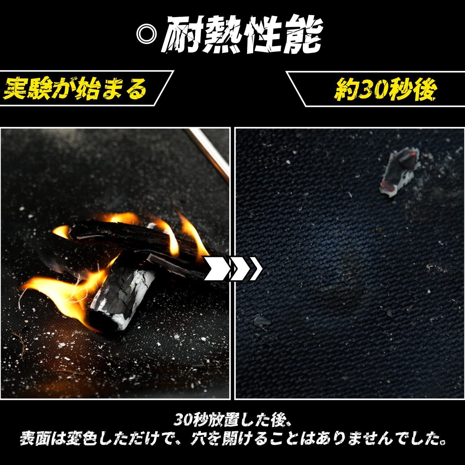 芝生を保護する:キャンプ場でよく芝生が焦げてたりしているのを見て、残念な思いはありませんでしたか?高密度ガラス繊維+両面シリコンコーティングにより3層構造で耐火性はより高く、熱伝導率が低く、焚き火台の下に敷いて灰で芝生や地面など、環境へのダメージを軽減してくれます●断熱シートではないため地面への熱を遮断できるわけではありません。●シートの上で直火はできません