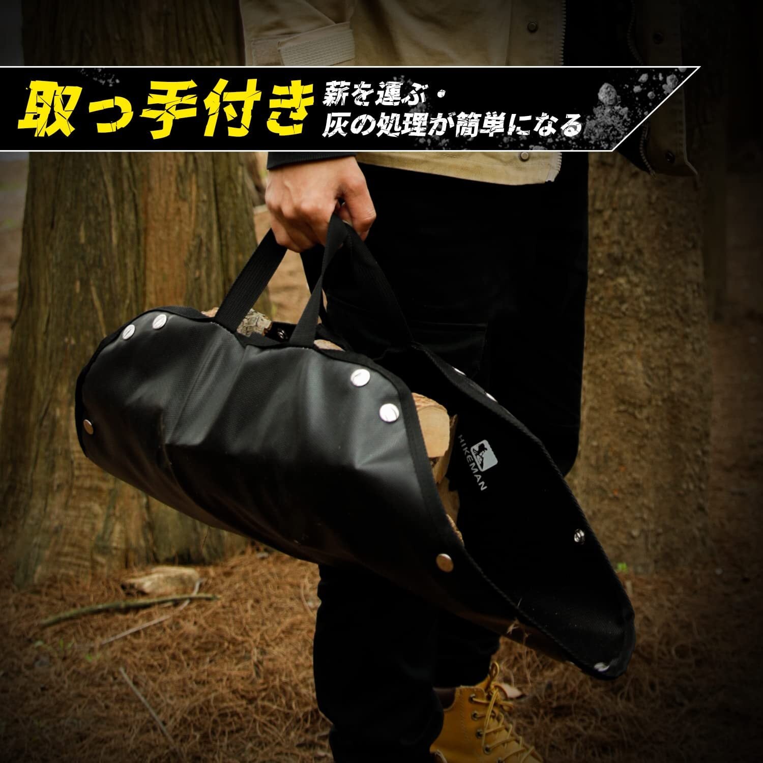 便利な取っ手と収納袋付き:スパッタシートの両側にしっかりとした取っ手付きデザイン、薪運びにもガンガン使えます。そして片付け際、灰を袋を移して捨てるのも簡単です。巾着式の収納袋に収納すればコンパクトになり、軽くて持ち運びしやすく、他に煤などの汚れがうつる心配もありません