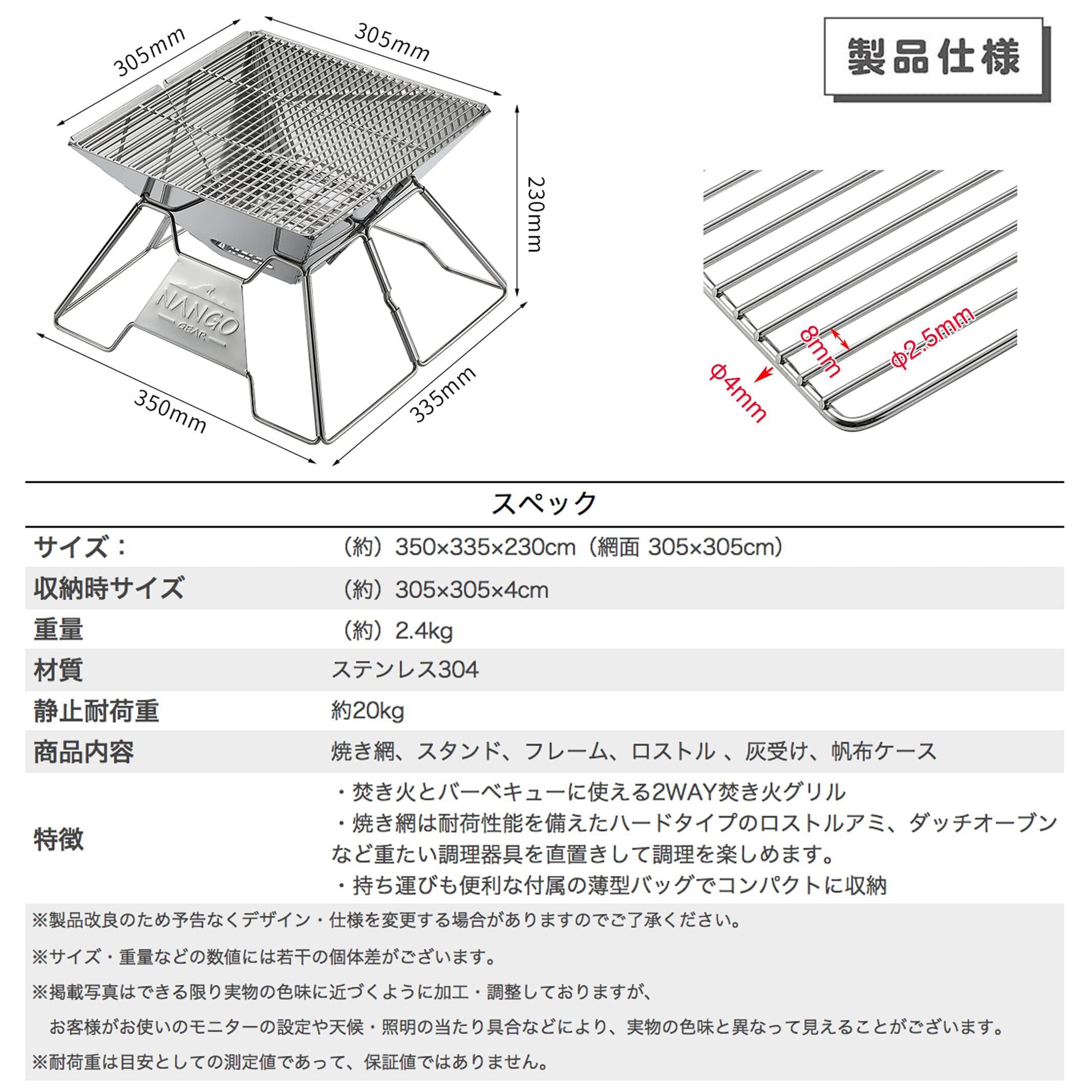 材質:焼き網・ロストル/SUS304、フレーム・スタンド・灰受/SUS201、収納ケース/帆布