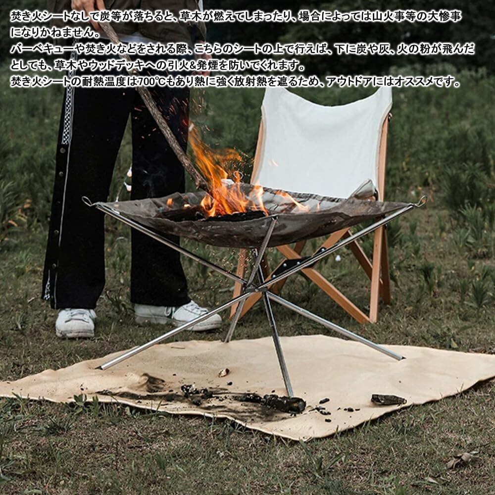 【高耐熱焚き火シート】 焚き火やBBQによる飛び火で地面を傷めないのはキャンプの基本マナー。焚き火台やグリル台からの飛び火等による地面の植物や地中の微生物への被害を最小限にするために焚き火シートをお使いください。たき火時の専用シートとして開発され、作業の耐熱温度は700℃で、瞬間使用温度1500℃です。焚き火台から落ちる火の粉や燃えかすがこぼれた時に地面や芝、ウッドデッキ等のダメージを軽減する焚き火シートです。地面を焦がさず環境に配慮しながら焚き火をお楽しみください!スタイリッシュなオールブラック色。軽量で折りたためるので持ち運び時も便利な焚き火台シートです。