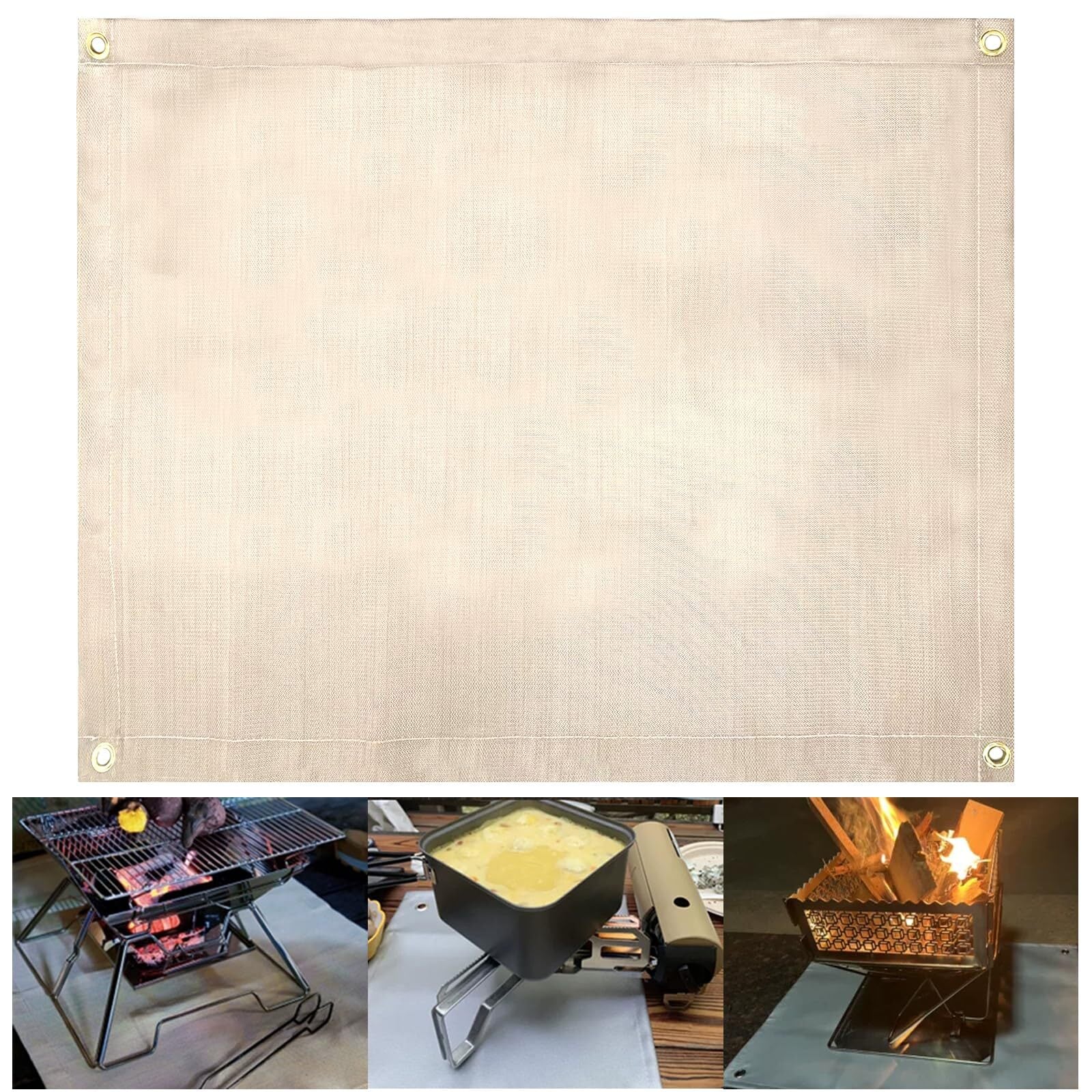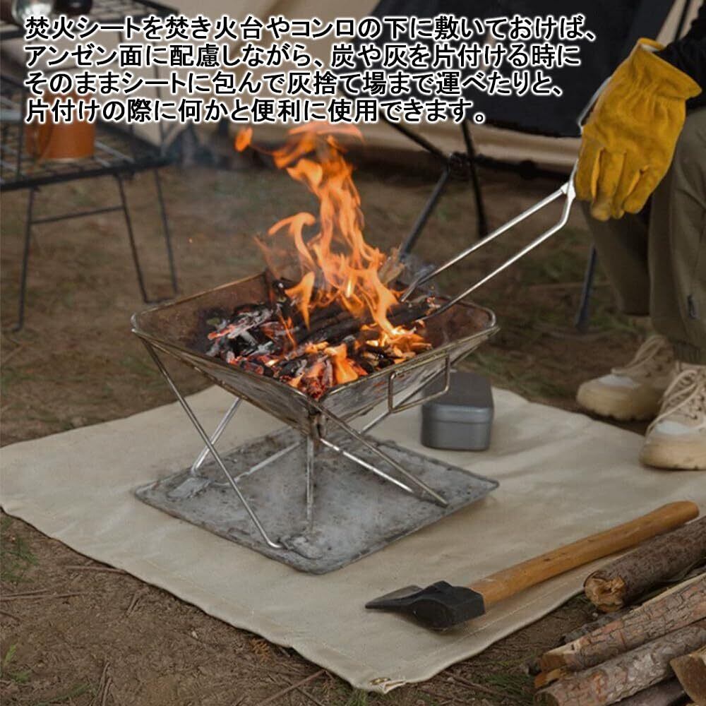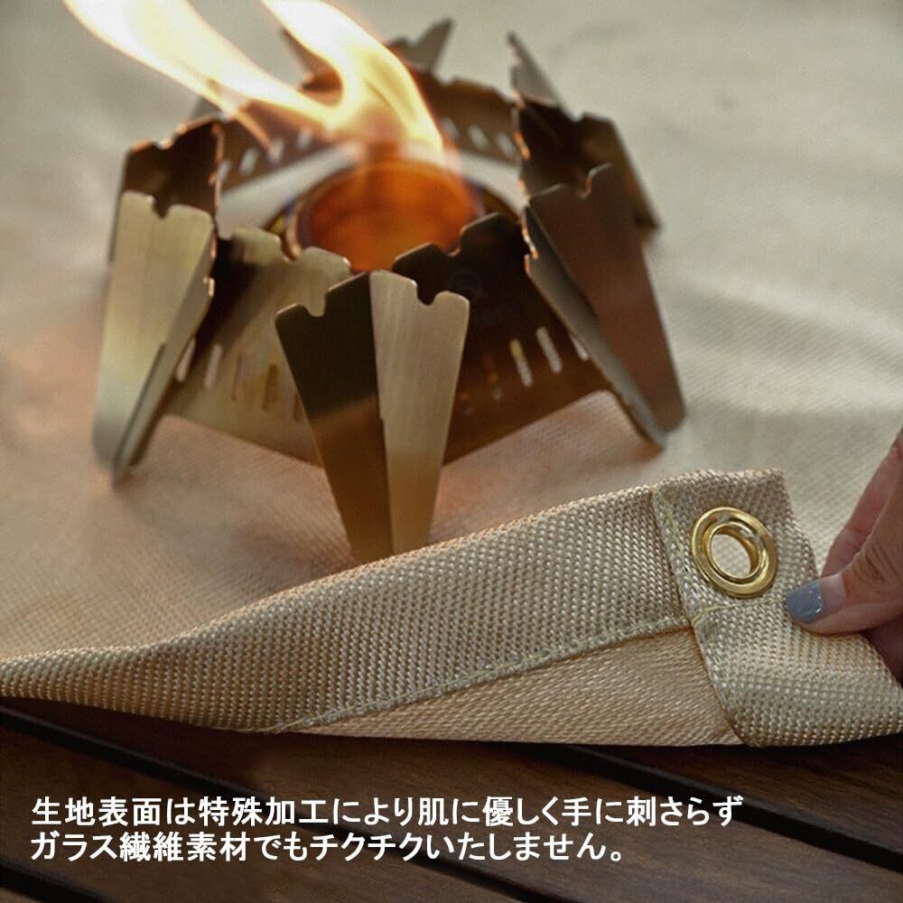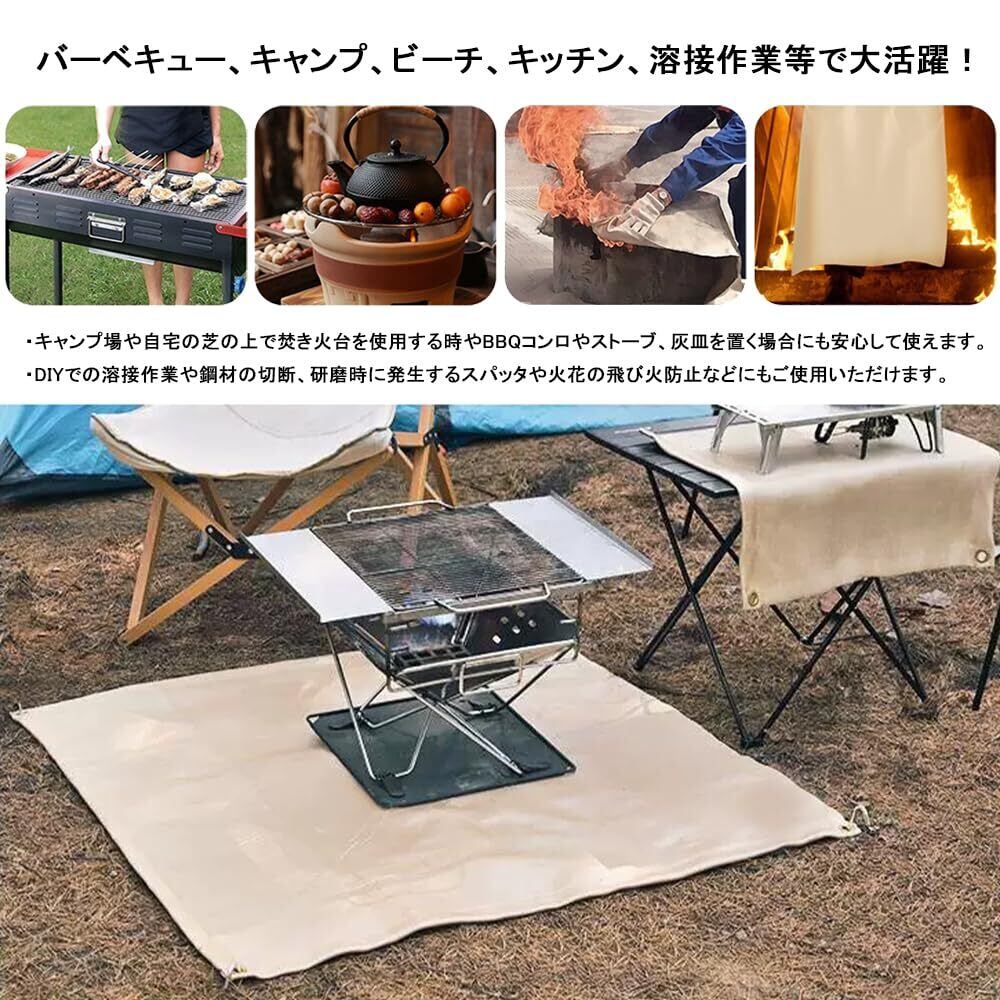 【完璧なエッジング】 縫い目はしっかりしているので、プロの裾上げにより、製品はより美しく見えます。普通の洒落た敷物として違和感ありません。高級ガラス繊維布なので、見た目は色が薄く見えます。普通のガラス繊維と比較して、表面がより滑らかに、柔らかくなり、素手で触るとちくちくする発生を効果的に回避します。注意事項:使用後、焚き火台シートを洗濯機に入れない方がいいです。そして、丸洗いしない方がいいと思います。はたいた後に、絞った雑巾で何回か拭けば汚れは十分に落ちます。焚火シートを折り畳むと、専用の厚めの収納袋に保管して、携帯に便利です。