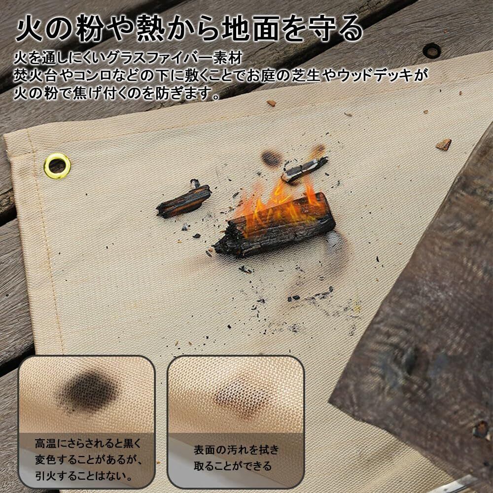 【注意事項】 本シートは耐火・耐熱シートであり、断熱シートではありません。シート上に高温なものがあるとシート越しに地面に熱が伝わる恐れがあります。飛び火からの延焼を防ぐ道具とご理解ください。一般的にガラス繊維製の焚き火シートは飛び火による瞬間的な熱から地面を守り、延焼を防ぎますが、焚き火台からの継続的な輻射熱は地面に伝わります。地面や芝を守るために、火床と地面を離す(20cm以上)、若しくは水に濡らした木等、断熱性のあるものを焚き火台と焚き火シートの間に置いてください。