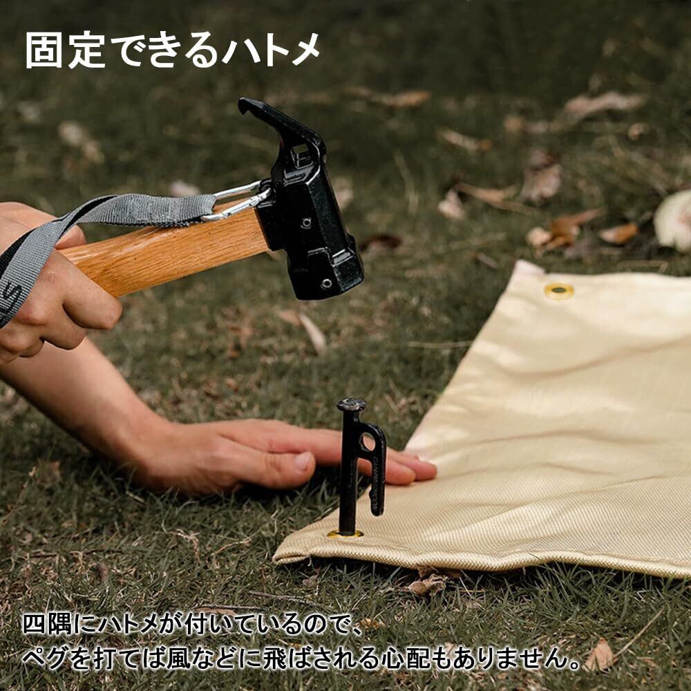 【固定できるハトメ】 ハトメがあるので、焚き火シートの4つの穴を通して、ペグで焚き火台シートを地面にしっかり固定でき、フックに掛けることもできます。風が強くなければそのままでも大丈夫っちゃ大丈夫そうですが。特に軽めの焚き火台を持っている人はペグを忘れずに!