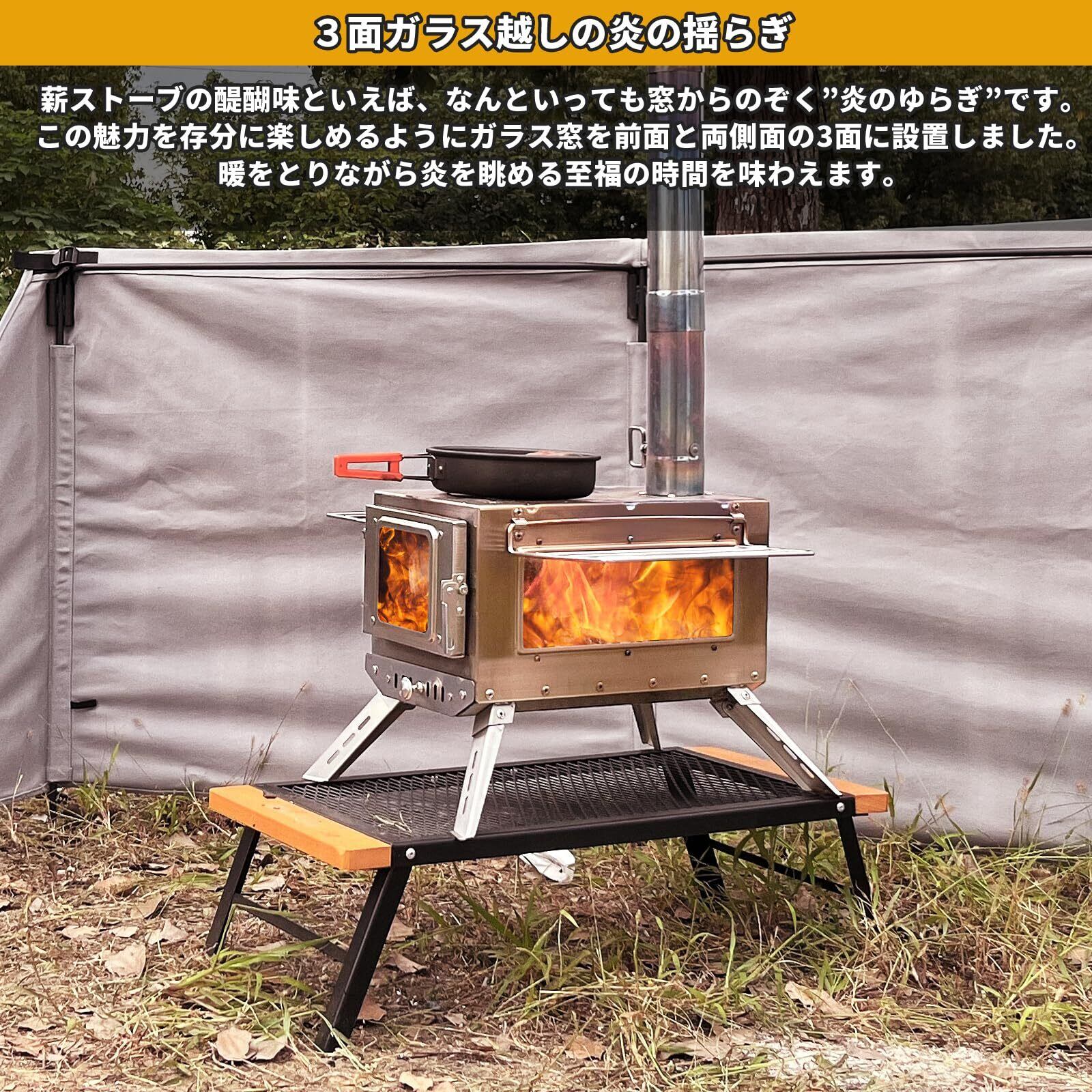 【高品質・ガラス窓】薪ストーブ本体はサビに強いステンレススチールで作れ、錆びに強く腐食しにくい、耐熱性、耐久性及び耐低温特性が抜群で、どんな厳しいアウトドアシーンにも耐えられます。ガラス窓が付き、扉を開けなくても火を確認できます。側面窓:260×90mm、前のドア窓:100×100mm、大きい窓サイズでストーブの中の薪の燃焼状態を確認しやすいし、炎のゆらめきもたっぷり楽しめます。