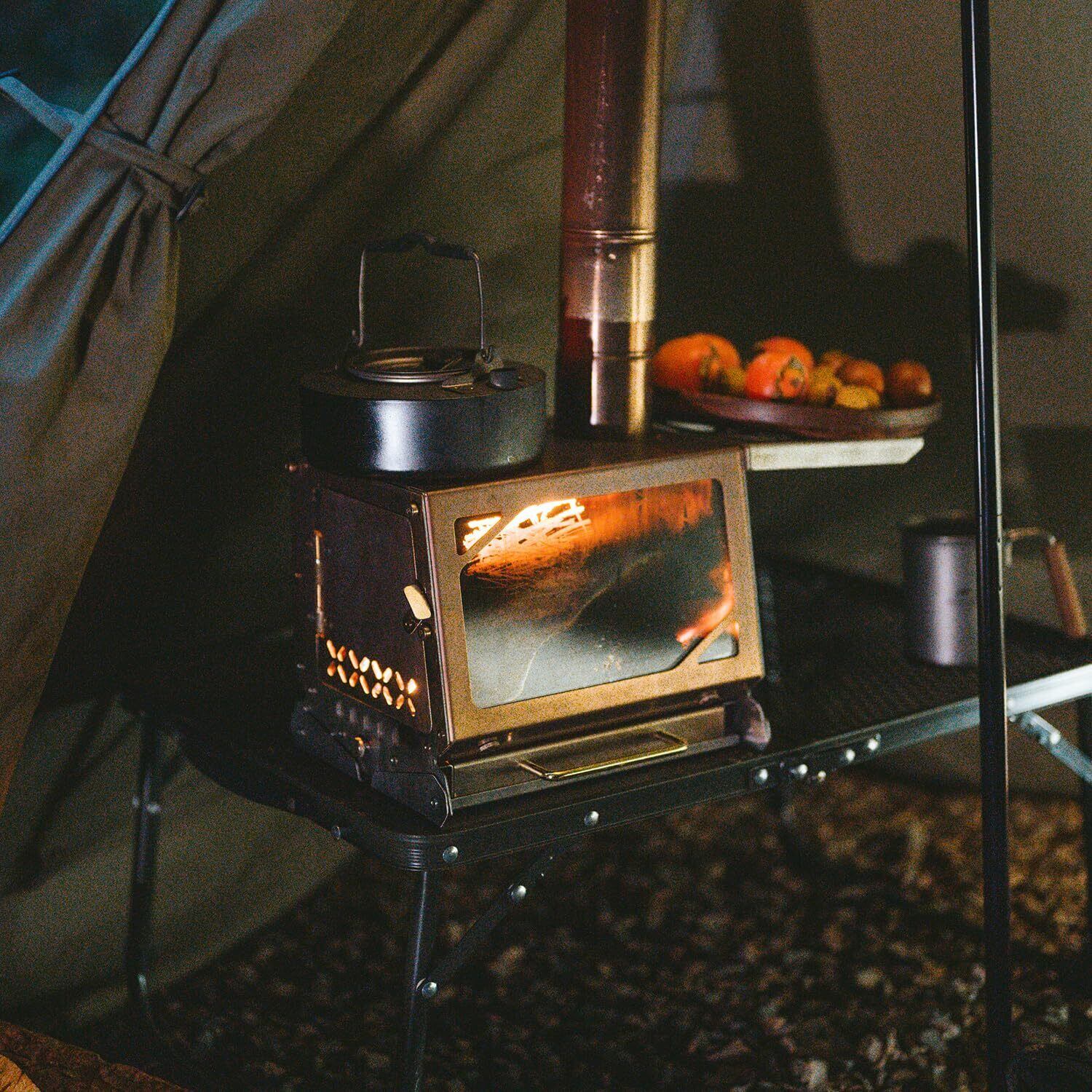 【テーブル上で焚き火に癒されながら自分時間を楽しめる】耐熱ガラス一面付き、焚き火のゆらぐ炎を見ながら調理も楽しめるミニ薪ストーブ。大きな薪をご用意いただく必要がなく、枝や端材を入れるだけなのでどなたでも簡単に使用できる。延長煙突を買えば、テントに設置して暖房器具としても使用できる、少ない燃料でも効率の良い火力を誇る。
