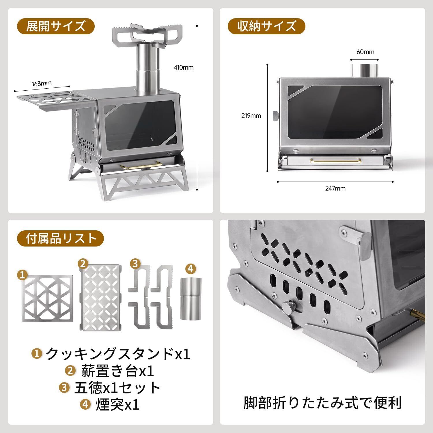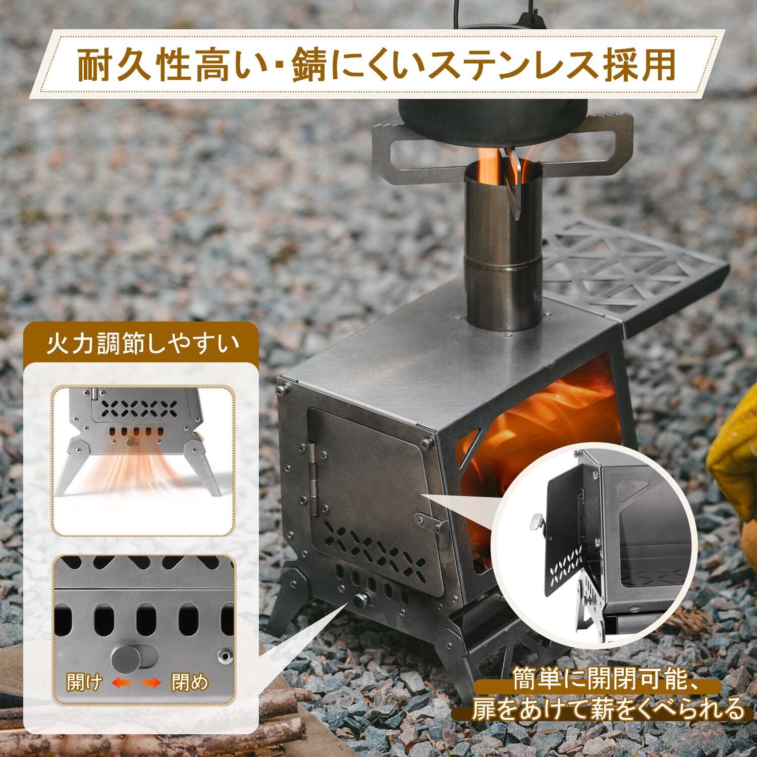 【錆びにくいステンレス材、仕様でお手入れも簡単】軽くて錆びにくいステンレス素材、扉をあけて薪をくべられる、火力調節もしやすい。底部に灰受け付き、片付けに時間を取られることなく、ゆっくりキャンプを楽しめる。