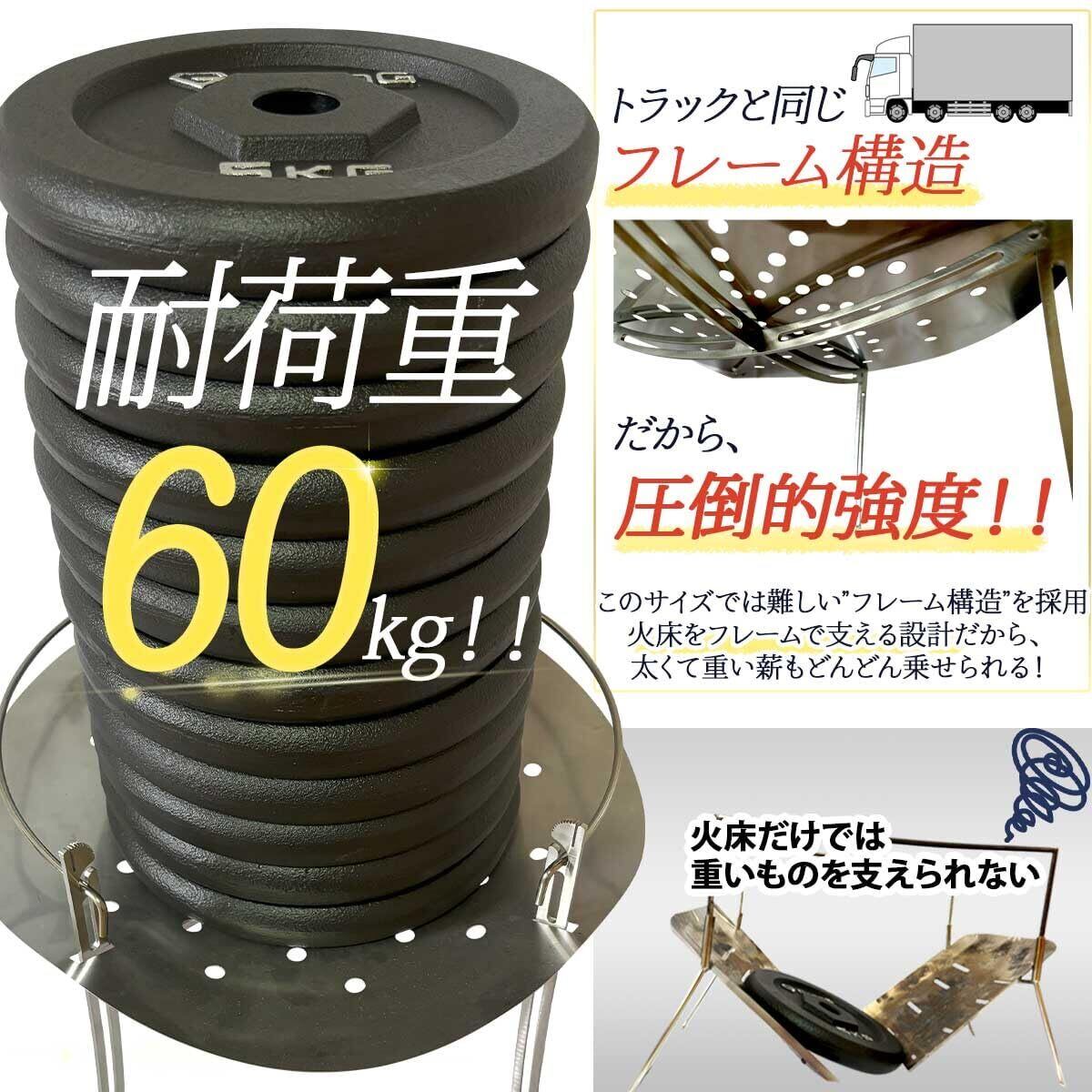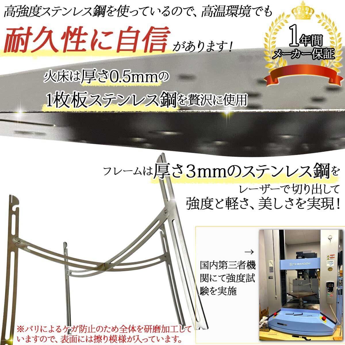 火床は厚さ0.5mmのステンレススチール、火床を支えるスタンドは厚さ3mmの高強度ステンレススチールを使用しています。