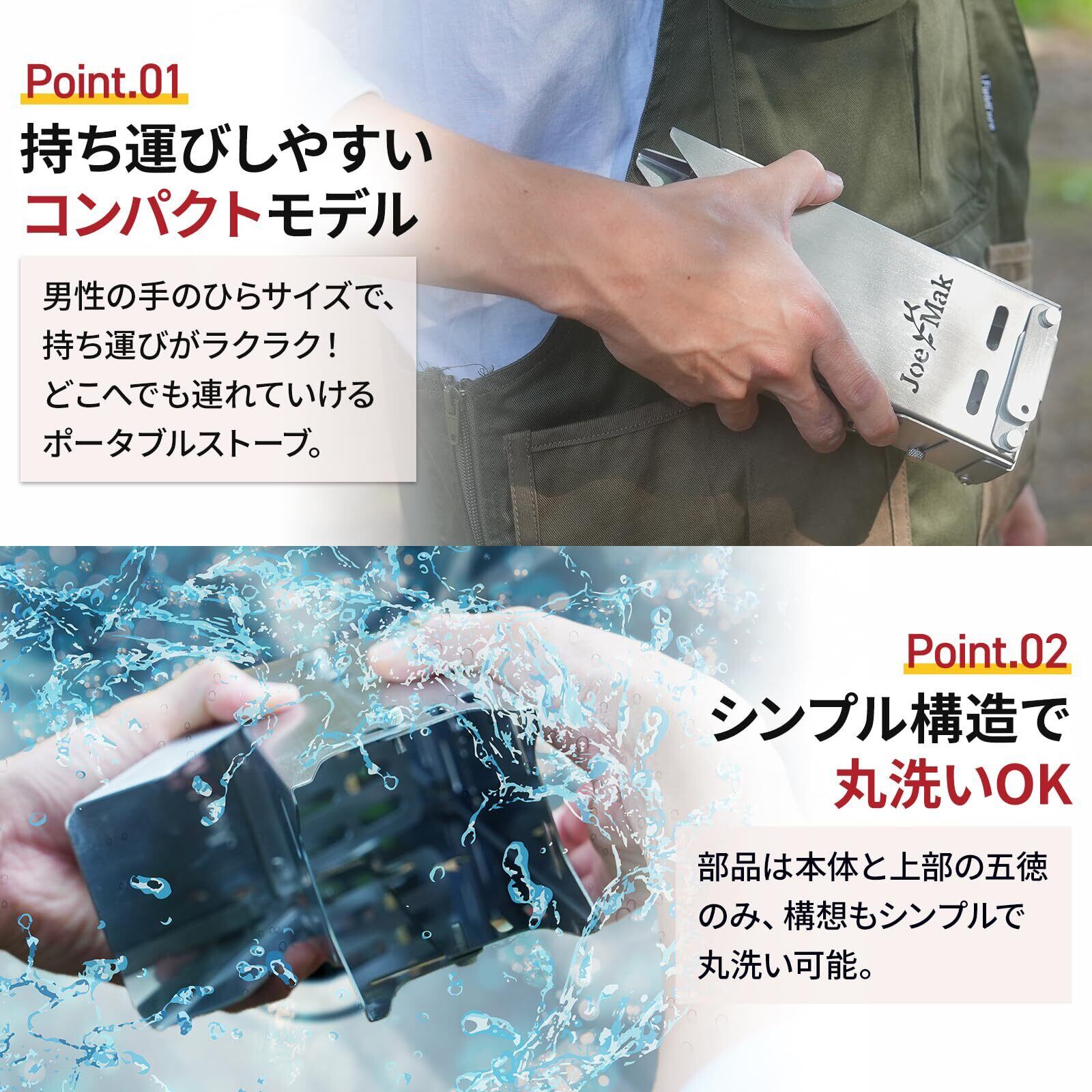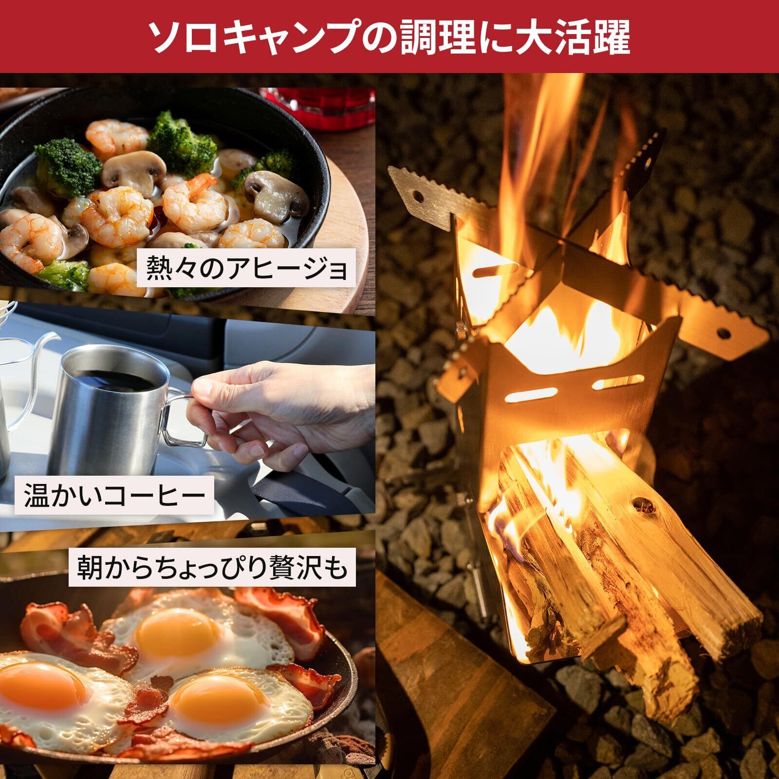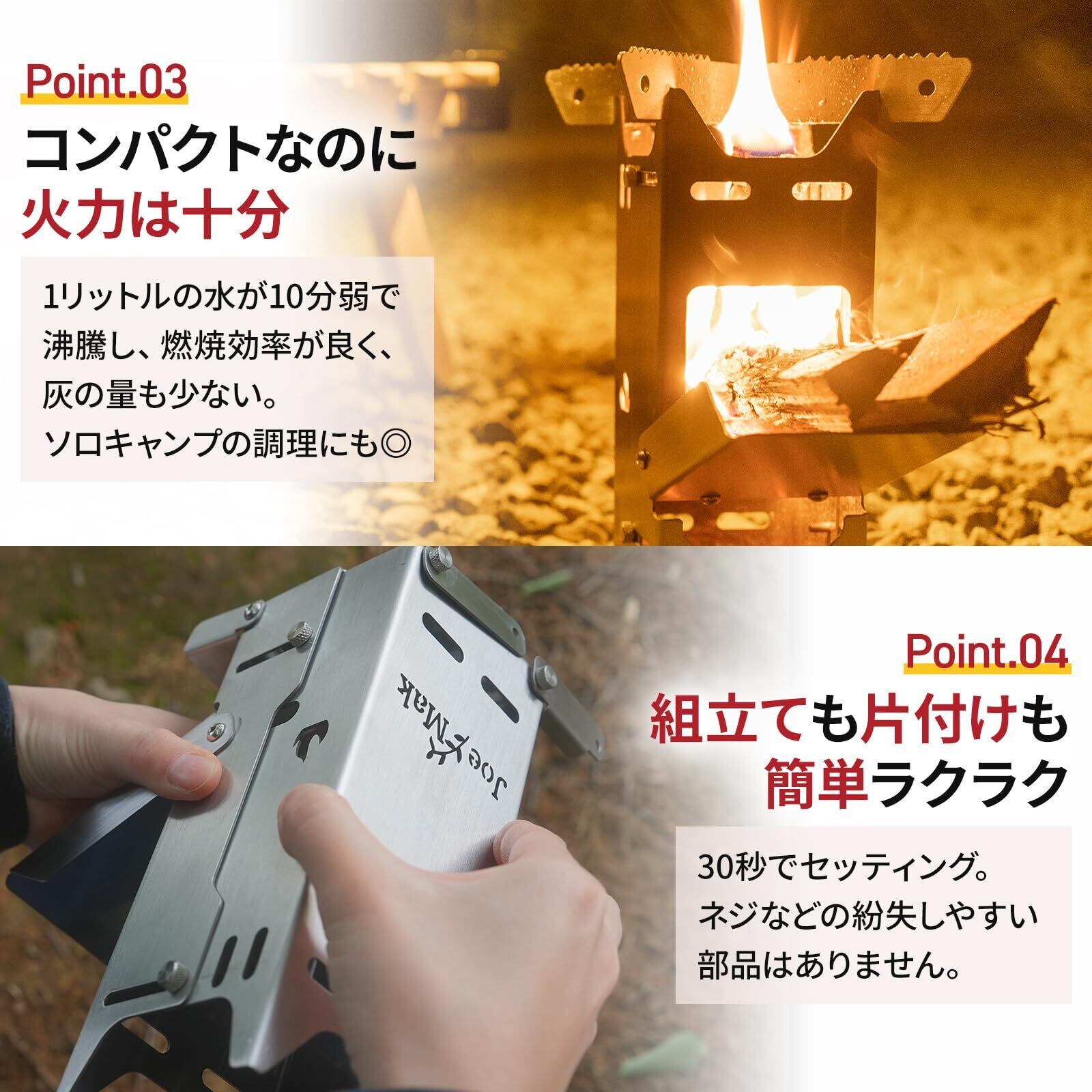 【小さくても十分な火力】持ち運びのしやすさを追求しつつ、火力を犠牲にすることなく設計されました。小さなサイズながら、1リットルの水を10分で沸騰させることが可能。燃焼効率も抜群で、灰の量も少なく、ソロキャンプに最適です。