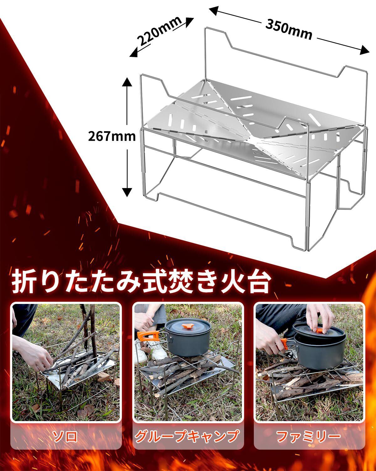 【高い燃焼効率】 底部には専用の通気孔が備わり、優れた通気性を確保し、燃焼効率を向上させ、より良い焚き火体験をもたらします。この折り畳み式焚き台はステンレス製で、全身水洗可能なため、錆など心配はありません。
