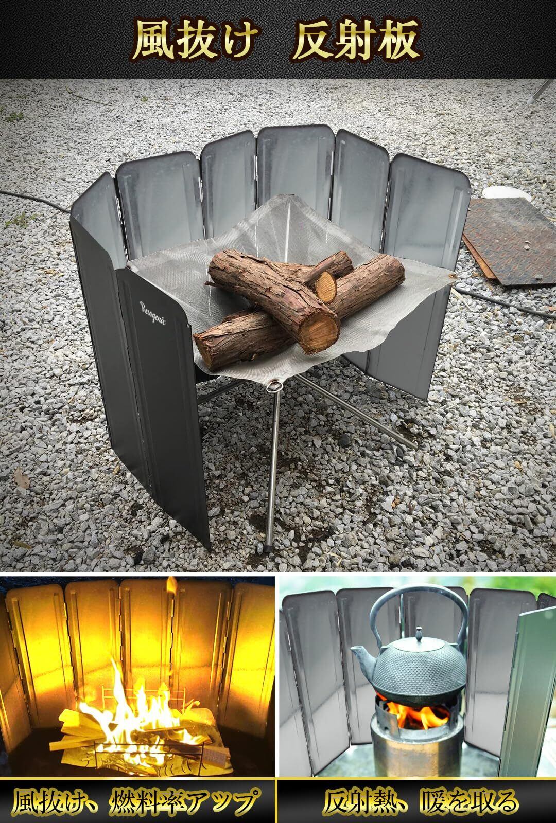 【1台多役の焚き火リフレクター】暖房効果を作りたり、火粉の飛散りを防止して火事未然に防ぎ、風よけて炎を安定に燃焼させたり、燃料を節約でき、1台で多くの役割を果たしています。野外で焚き火やバーベキュー、料理などの際に、油の飛び散りを防ぎ、風からも守ってくれるので、炎がよく燃え、燃料の無駄が減り、燃焼効率が大幅に向上し、調理時間が大幅に短縮されます。キャンプには欠かせないアイテムです。